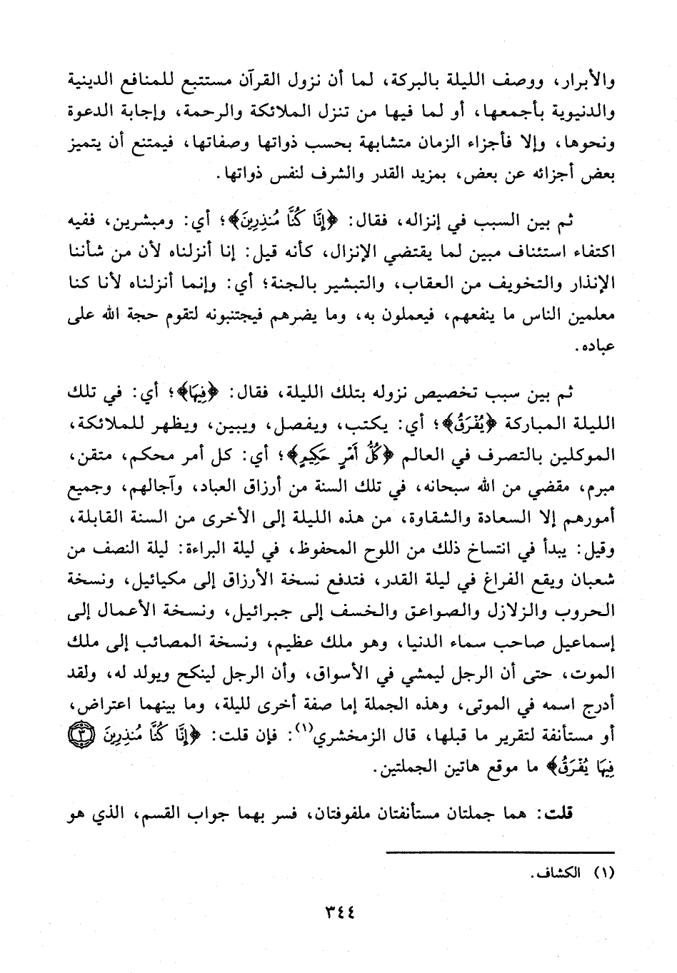 والأبرار، ووصف الليلة بالبركة، لما أن نزول القرآن مستتبع للمنافع الدينية والدنيوية بأجمعها، أو لما فيها من تنزل الملائكة والرحمة، وإجابة الدعوة ونحوها، وإلا فأجزاء الزمان متشابهة بحسب ذواتها وصفاتها، فيمتنع أن يتميز بعض أجزائه عن بعض، بمزيد القدر والشرف لنفس ذواتها.
