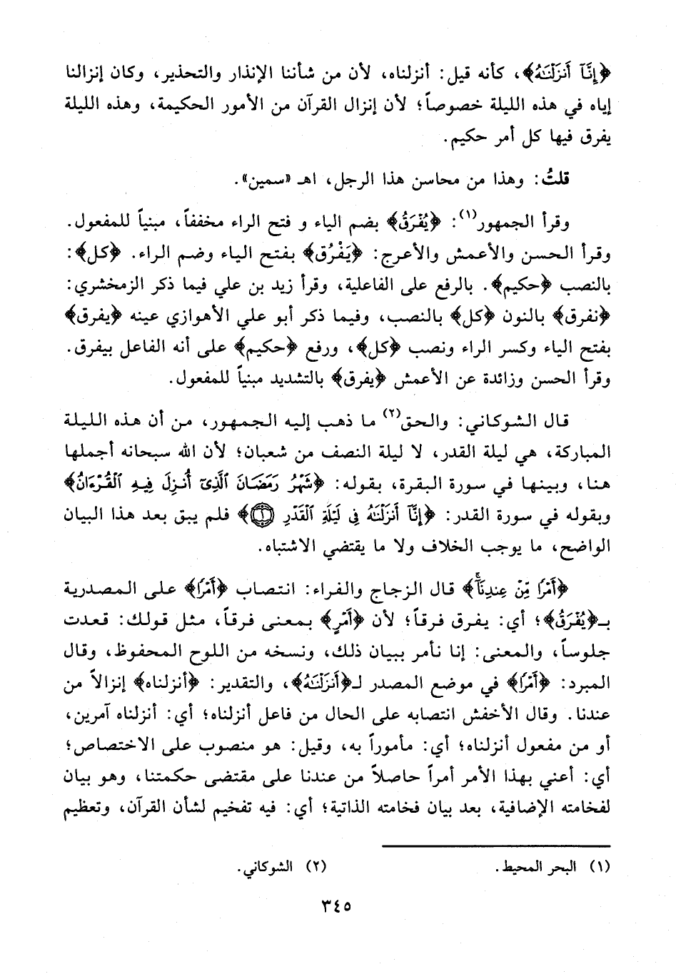 قال الشوكاني: والحق (¬2) ما ذهب إليه الجمهور، من أن هذه الليلة المباركة، هي ليلة القدر، لا ليلة النصف من شعبان؛ لأن الله سبحانه أجملها هنا، وبينها في سورة البقرة، بقوله: {شَهْرُ رَمَضَانَ الَّذِي أُنْزِلَ فِيهِ الْقُرْآنُ} وبقوله في سورة القدر: {إِنَّا أَنْزَلْنَاهُ فِي لَيْلَةِ الْقَدْرِ (1)} فلم يبق بعد هذا البيان الواضح، ما يوجب الخلاف ولا ما يقتضي الاشتباه.