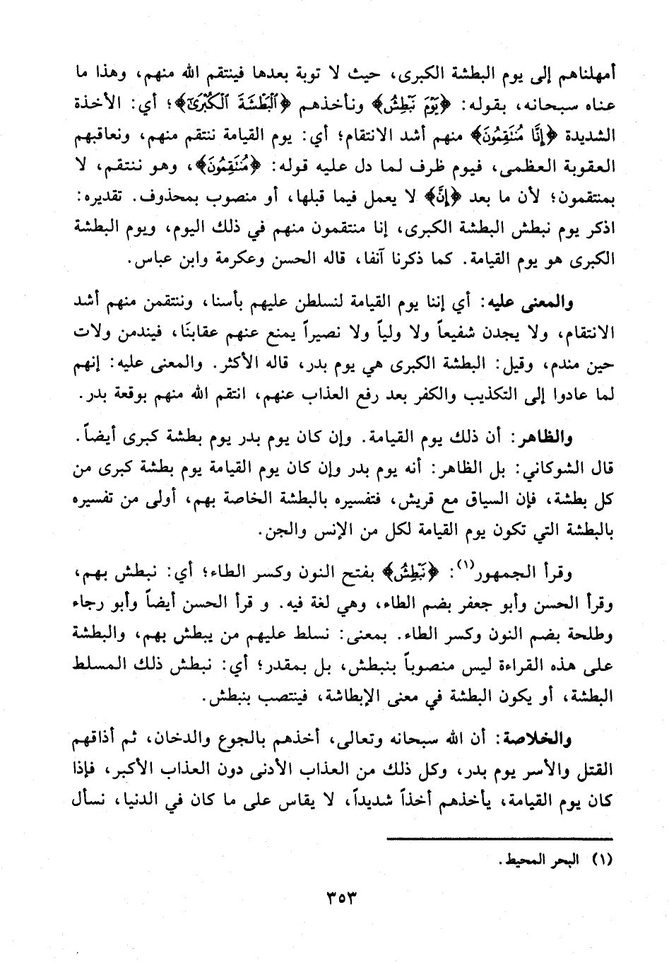 والمعنى عليه: أي إننا يوم القيامة لنسلطن عليهم بأسنا، وننتقمن منهم أشد الانتقام، ولا يجدن شفيعًا ولا وليًا ولا نصيرًا يمنع عنهم عقابنا، فيندمن ولات حين مندم، وقيل: البطشة الكبرى هي يوم بدر، قاله الأكثر. والمعنى عليه: إنهم لما عادوا إلى التكذيب والكفر بعد رفع العذاب عنهم، انتقم الله منم بوقعة بدر.