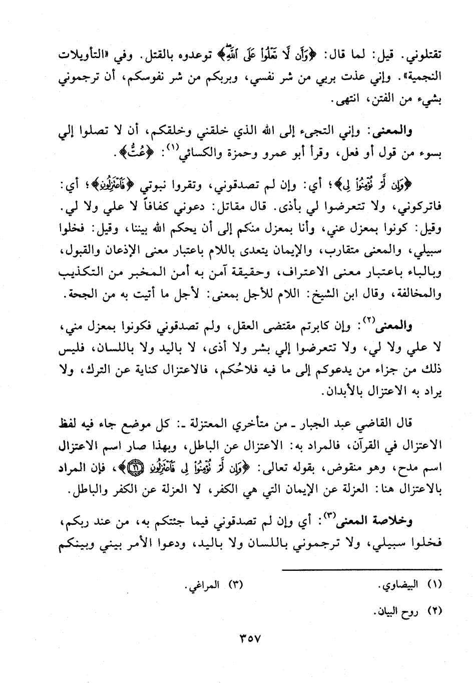 قال القاضي عبد الجبار - من متأخري المعتزلة -: كل موضع جاء فيه لفظ الاعتزال في القرآن، فالمراد به: الاعتزال عن الباطل، وبهذا صار اسم الاعتزال اسم مدح، وهو منقوض، بقوله تعالى: {وَإِنْ لَمْ تُؤْمِنُوا لِي فَاعْتَزِلُونِ (21)}، فإن المراد بالاعتزال هنا: العزلة عن الإيمان التي هي الكفر، لا العزلة عن الكفر والباطل.
