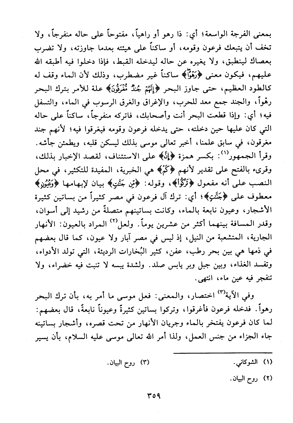 وفي الآية (¬3) اختصار، والمعنى: فعل موسى ما أمر به، بأن ترك البحر رهوًا. فدخله فرعون فأغرقوا، وتركوا بساتين كثيرةً وعيونًا نابعةً، قال بعضهم: لما كان فرعون يفتخر بالماء وجريان الأنهار من تحت قصره، وأشجار بساتينه جاء الجزاء من جنس العمل، ولذا أمر الله تعالى موسى عليه السلام، بأن يسير