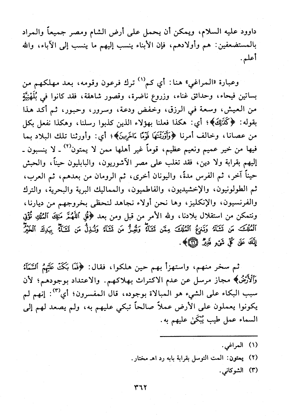 وعبارة "المراغي" هنا: أي كم (¬1) ترك فرعون وقومه، بعد مهلكهم من بساتين فيحاء، وحدائق غناء، وزروع ناضرة، وقصور شاهقة، فقد كانوا في بُلَهْنِيَّةٍ من العيش، وسعة في الرزق، وخفض ودعة، وسرور، وحبور، ثم أكد هذا بقوله: {كَذَلِكَ}؛ أي: هكذا فعلنا بهؤلاء الذين كذبوا رسلنا، وهكذا نفعل بكل من عصانا، وخالف أمرنا {وَأَوْرَثْنَاهَا قَوْمًا آخَرِينَ}؛ أي: وأورثنا تلك البلاد بما فيها من خير عميم ونعيم عظيم، قومًا غير أهلها ممن لا يمتون (¬2) - لا ينسبون - إليهم بقرابة ولا دين، فقد تغلب على مصر الآشوريون، والبابليون حينًا، والحبش حينًا آخر، ثم الفرس مدةً، واليونان أخرى، ثم الرومان من بعدهم، ثم العرب، ثم الطولونيون، والإخشيديون، والفاطميون، والمماليك البرية والبحرية، والترك والفرنسيون، والإنكليز، وها نحن أولاء نجاهد لنحظى بخروجهم من ديارنا، ونتمكن من استقلال بلادنا، ولله الأمر من قبل ومن بعد {قُلِ اللَّهُمَّ مَالِكَ الْمُلْكِ تُؤْتِي الْمُلْكَ مَنْ تَشَاءُ وَتَنْزِعُ الْمُلْكَ مِمَّنْ تَشَاءُ وَتُعِزُّ مَنْ تَشَاءُ وَتُذِلُّ مَنْ تَشَاءُ بِيَدِكَ الْخَيْرُ إِنَّكَ عَلَى كُلِّ شَيْءٍ قَدِيرٌ (26)}.