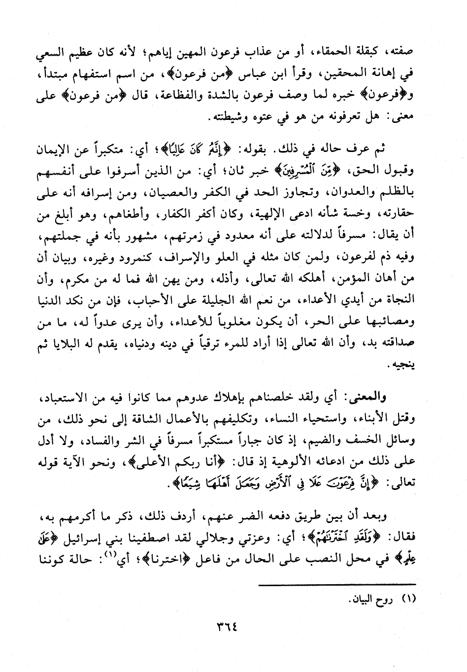 ثم عرف حاله في ذلك. بقوله: {إِنَّهُ كَانَ عَالِيًا}؛ أي: متكبرًا عن الإيمان وقبول الحق، {مِنَ الْمُسْرِفِينَ} خبر ثان؛ أي: من الذين أسرفوا على أنفسهم بالظلم والعدوان، وتجاوز الحد في الكفر والعصيان، ومن إسرافه أنه على حقارته، وخسة شأنه ادعى الإلهية، وكان أكفر الكمار، وأطغاهم، وهو أبلغ من أن يقال: مسرفًا لدلالته على أنه معدود في زمرتهم، مشهور بأنه في جملتهم، وفيه ذم لفرعون، ولمن كان مثله في العلو والإصراف، كنمرود وغيره، وبيان أن من أهان المؤمن، أهلكة الله تعالى، وأذله، ومن يهن الله فما له من مكرم، وأن النجاة من أيدي الأعداء، من نعم الله الجليلة على الأحباب، فإن من نكد الدنيا ومصائبها على الحر، أن يكون مغلوبًا للأعداء، وأن يرى عدوًا له، ما من صداقته بد، وأن الله تعالى إذا أراد للمرء ترقيًا في دينه ودنياه، يقدم له البلايا ثم بنجيه.