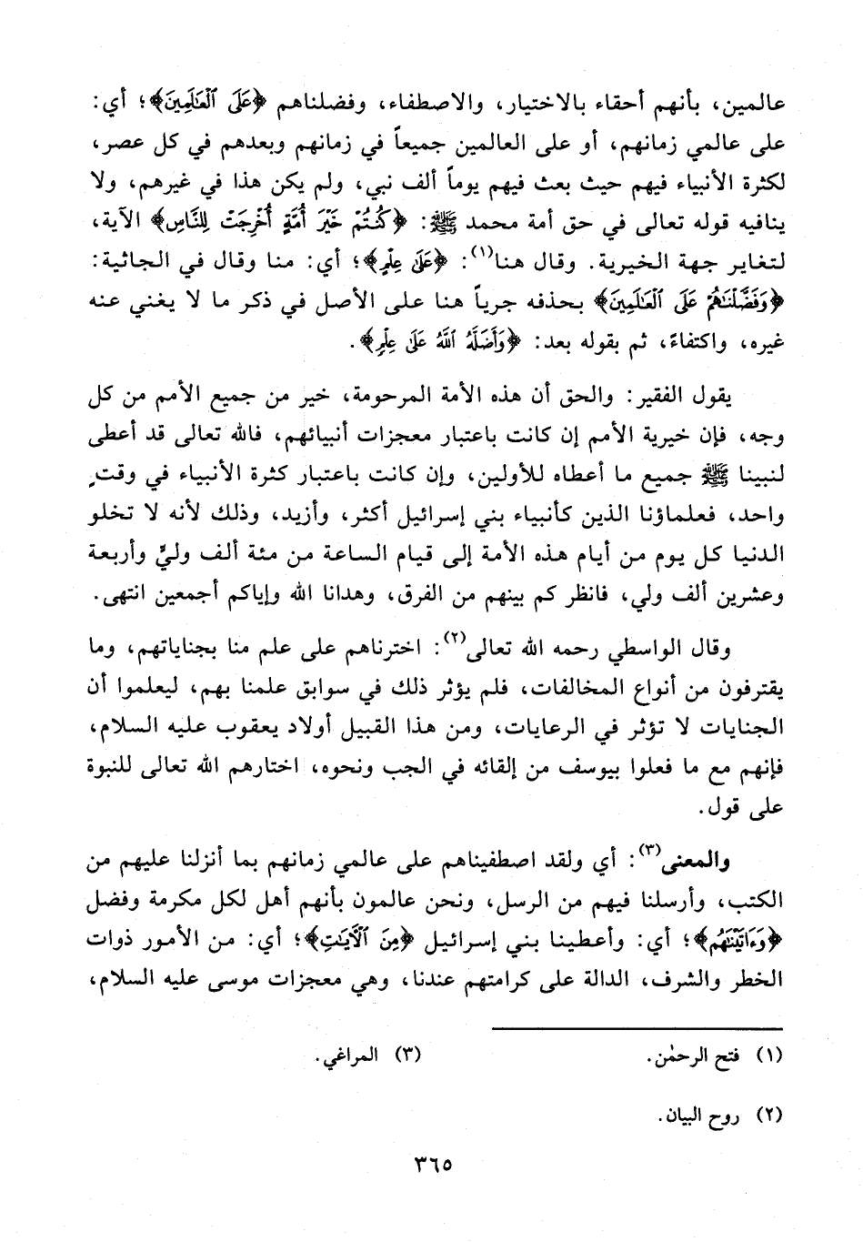 يقول الفقير: والحق أن هذه الأمة المرحومة، خير من جميع الأمم من كل وجه، فإن خيرية الأمم إن كانت باعتبار معجزات أنبيائهم، فالله تعالى قد أعطى لنبينا - صلى الله عليه وسلم - جميع ما أعطاه للأولين، وإن كانت باعتبار كثرة الأنبياء في وقتٍ واحد، فعلماؤنا الذين كأنبياء بني إسرائيل أكثر، وأزيد، وذلك لأنه لا تخلو الدنيا كل يوم من أيام هذه الأمة إلى قيام الساعة من مئة ألف وليٍّ وأربعة وعشرين ألف ولي، فانظر كم بينهم من الفرق، وهدانا الله وإياكم أجمعين انتهى،