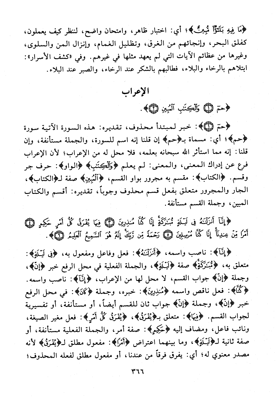 {إِنَّا}: ناصب واسمه، {أَنْزَلْنَاهُ}: فعل وفاعل ومفعول به، {فِي لَيْلَةٍ}: متعلق به، {مُبَارَكَةٍ} صفة {لَيْلَةٍ}، والجملة الفعلية في محل الرفع خبر {إنّ}، وجملة {إنّ} جواب القسم، لا محل لها من الإعراب، {إِنَّا}: ناصب واسمه. {كُنَّا}: فعل ناقص واسمه {مُنْذِرِينَ}: خبره، وجملة {كَانَ}: في محل الرفع خبر {إنّ}، وجملة {إنّ} جواب ثان للقسم أيضًا، أو مستأنفة، أو تفسيرية لجواب القسم. {فِيهَا}: متعلق بـ {يُفرَقُ}، {يُفْرَقُ كُلُّ أَمْرٍ}: فعل مغير الصيغة، ونائب فاعل، ومضاف إليه {حَكِيمٍ}: صفة أمر، والجملة الفعلية مستأنفة، أو صفة ثانية لـ {لَيْلَةٍ}، وما بينهما اعتراض {أَمْرٍ}: مفعول مطلق لـ {يُفْرَقُ} لأنه مصدر معنوي له؛ أي: يفرق فرقًا من عندنا، أو مفعول مطلق لفعله المحذوف؛