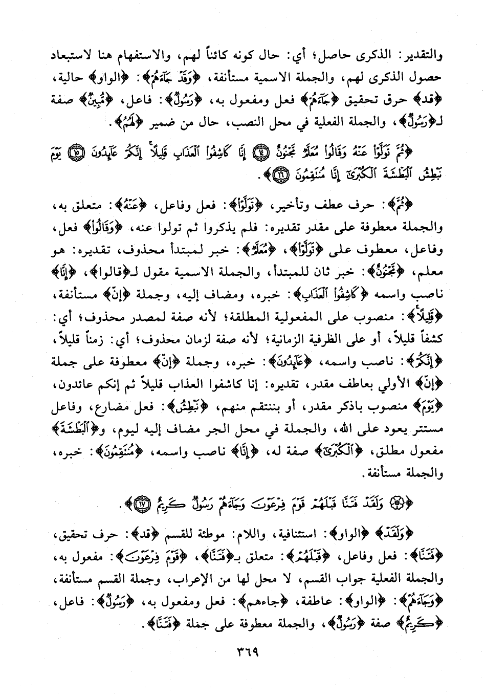 {ثُمَ}: حرف عطف وتأخير، {تَوَلَّوْا}: فعل وفاعل، {عَنْهُ}: متعلق به، والجملة معطوفة على مقدر تقديره: فلم يذكروا ثم تولوا عنه، {وَقَالُوا} فعل، وفاعل، معطوف على {تَوَلَّوْا}، {مُعَلَّمٌ}: خبر لمبتدأ محذوف، تقديره: هو معلم، {مَجْنُونٌ}: خبر ثان للمبتدأ، والجملة الاسمية مقول لـ {قالوا}، {إنَا} ناصب واسمه {كَاشِفُو الْعَذَابِ}: خبره، ومضاف إليه، وجملة {إنّ} مستأنفة، {قَلِيلًا}: منصوب على المفعولية المطلقة؛ لأنه صفة لمصدر محذوف؛ أي: كشفًا قليلًا، أو على الظرفية الزمانية؛ لأنه صفة لزمان محذوف؛ أي: زمنًا قليلًا، {إِنَّكُمْ}: ناصب واسمه، {عَائِدُونَ}: خبره، وجملة {إنّ} معطوفة على جملة {إنّ} الأولي بعاطف مقدر، تقديره: إنا كاشفوا العذاب قليلًا ثم إنكم عائدون، {يَوْمَ} منصوب باذكر مقدر، أو بننتقم منهم، {نَبْطِشُ}: فعل مضارع، وفاعل مستتر يعود على الله، والجملة في محل الجر مضاف إليه ليوم، و {الْبَطْشَةَ} مفعول مطلق، {الْكُبْرَى} صفة له، {إنَا} ناصب واسمه، {مُنْتَقِمُونَ}: خبره، والجملة مستأنفة.