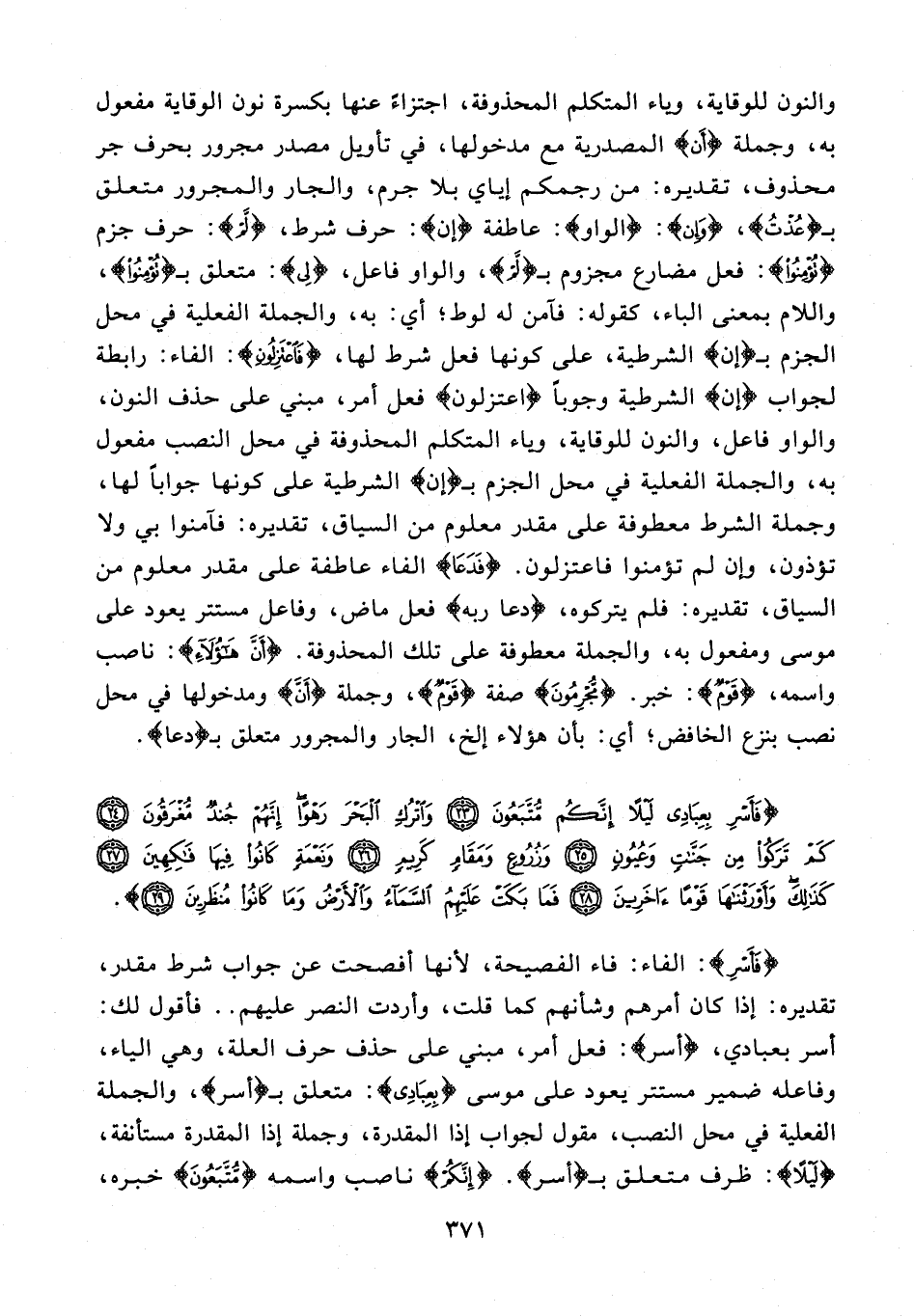 {فَأَسْرِ}: الفاء: فاء الفصيحة؛ لأنها أفصحت عن جواب شرط مقدر، تقديره: إذا كان أمرهم وشأنهم كما قلت، وأردت النصر عليهم .. فأقول لك: أسر بعبادي، {أسر}: فعل أمر، مبني على حذف حرف العلة، وهي الياء، وفاعله ضمير مستتر يعود على موسى {بِعِبَادِي}: متعلق بـ {أسر}، والجملة الفعلية في محل النصب، مقول لجواب إذا المقدرة، وجملة إذا المقدرة مستأنفة، {لَيْلًا}: ظرف متعلق بـ {أسر}. {إِنَّكُمْ} ناصب واسمه {مُتَّبَعُونَ} خبره،