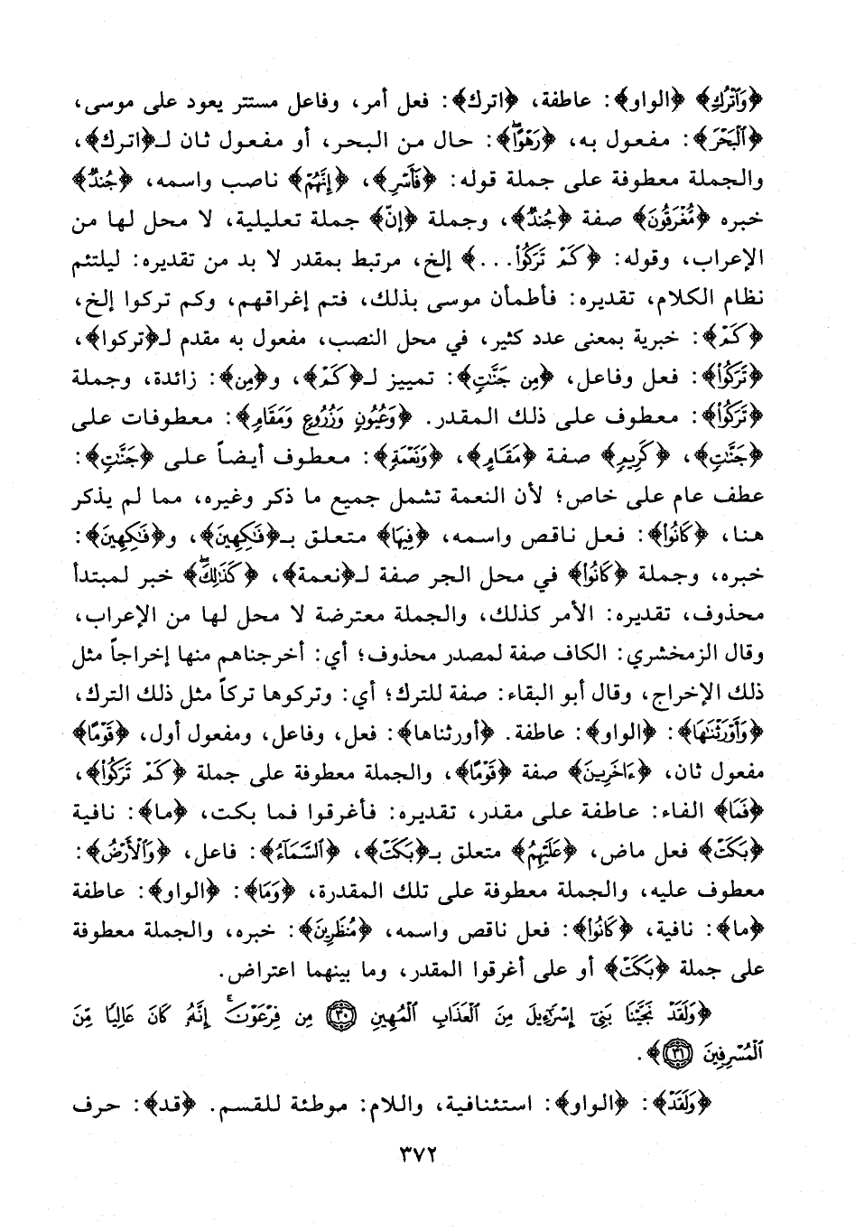 {وَاتْرُكِ} {الواو}: عاطفة، {أترك}: فعل أمر، وفاعل مستتر يعود على موسى، {الْبَحْرَ}: مفعول به، {رَهْوًا}: حال من البحر، أو مفعول ثان لـ {اترك}، والجملة معطوفة على جملة قوله: {فَأَسْرِ}، {إِنَّهُمْ} ناصب واسمه، {جُنْدٌ} خبره {مُغْرَقُونَ} صفة {جُنْدٌ}، وجملة {إنّ} جملة تعليلية، لا محل لها من الإعراب، وقوله: {كَمْ تَرَكُوا ...} إلخ، مرتبط بمقدر لا بد من تقديره: ليلتئم نظام الكلام، تقديره: فأطمأن موسى بذلك، فتم إغراقهم، وكم تركوا إلخ، {كَمْ}: خبرية بمعنى عدد كثير، في محل النصب، مفعول به مقدم لـ {تركوا}، {تَرَكُوا}: فعل وفاعل، {مِنْ جَنَّاتٍ}: تمييز لـ {كَمّ}، و {مِنْ}: زائدة، وجملة {تَرَكُوا}: معطوف على ذلك المقدر. {وَعُيُونٍ وَزُرُوعٍ وَمَقَامٍ}: معطوفات على {جَنَّاتٍ}، {كَرِيمٍ} صفة {مَقَامٍ}، {وَنَعْمَةٍ}؛ معطوف أيضًا على {جَنَّاتٍ} عطف عام على خاص؛ لأن النعمة تشمل جميع ما ذكر وغيره، مما لم يذكر هنا، {كَانُوا}: فعل ناقص واسمه، {فِيهَا} متعلق بـ {فَاكِهِينَ}، و {فَاكِهِينَ}: خبره، وجملة؛ {كَانُوا} في محل الجر صفة لـ {نعمة}، {كَذَلِكَ} خبر لمبتدأ محذوف، تقديره: الأمر كذلك، والجمله معترضة لا محل لها من الإعراب، وقال الزمخشري: الكاف صفة لمصدر محذوف؛ أي: أخرجناهم منها إخراجًا مثل ذلك الإخراج، وقال أبو البقاء: صفة للترك؛ أي: وتركوها تركًا مثل ذلك الترك، {وَأَوْرَثْنَاهَا}: {الواو}: عاطفة. {أورثناها}: فعل، وفاعل، ومفعول أول، {قَوْمًا} مفعول ثان، {آخَرِينَ} صفة {قَوْمًا}، والجملة معطوفة على جملة {كَمْ تَرَكُوا}، {فَمَا} الفاء: عاطفة على مقدر، تقديره: فأغرقوا فما بكت، {ما}: نافية {بَكَتْ} فعل ماض، {عَلَيْهِمُ} متعلق بـ {بَكَتْ}، {السَّمَاءُ}: فاعل، {وَالْأَرْضُ}: معطوف عليه، والجملة معطوفة على تلك المقدرة، {وَمَا}: {الواو}: عاطفة {ما}: نافية، {كَانُوا}: فعل ناقص واسمه، {مُنْظَرِينَ}: خبره، والجملة معطوفة على جملة {بَكَتْ} أو على أغرقوا المقدر، وما بينهما اعتراض.