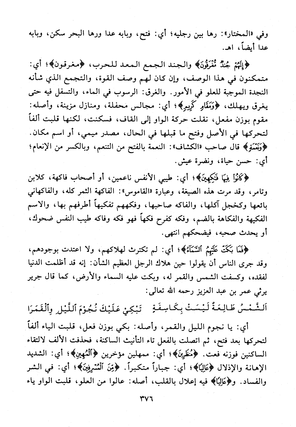 أي: يا نجوم الليل والقمر، وأصله: بكي بوزن فعل، قلبت الياء ألفًا لتحركها بعد فتح، ثم اتصلت بالفعل تاء التأنيث الساكنة، فحذفت الألف لالتقاء الساكنين فوزنه فعت. {مُنْظَرِينَ}؛ أي: ممهلين مؤخرين {الْمُهِينِ}؛ أي: الشديد الإهانة والإذلال {عَالِيًا}؛ أي: جبارًا متكبرًا. {مِنَ الْمُسْرِفِينَ}؛ أي: في الشر والفساد. و {عَالِيًا} فيه إعلال بالقلب، أصله: عالوا من العلو، قلبت الواو ياء