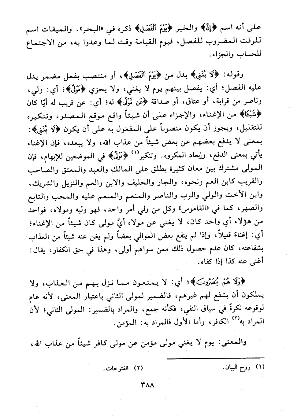 41 - وقوله: {لَا يُغْنِي} بدل من {يَوْمَ الْفَصْلِ}، أو منتصب بفعل مضمر يدل عليه الفصل؛ أي: يفصل بينهم يوم لا يغني، ولا يجزي {مَوْلًى}؛ أي: ولي، وناصر من قرابة، أو عتاق، أو صداقة {عَنْ مَوْلًى} له؛ أي: عن قريب له أيّا كان {شَيْئًا} من الإغناء، والإجزاء على أن شيئًا واقع موقع المصدر، وتنكيره للتقليل، ويجوز أن يكون منصوبًا على المفعول به على أن يكون {لَا يُغْنِي}: بمعنى لا يدفع بعضهم عن بعض شيئًا من عذاب الله، ولا يبعده، فإن الإغناء يأتي بمعنى الدفع، وإبعاد المكروه. وتنكير (¬1) {مَوْلًى} في الموضعين للإبهام، فان المولى مشترك بين معان كثيرة يطلق على المالك والعبد والمعتق والصاحب والقريب كابن العم ونحوه، والجار والحليف والابن والعم والنزيل والشريك، وابن الأخت والولي والرب والناصر والمنعم والمنعم عليه والمحب والتابع والصهر، كما في "القاموس" وكل من ولي أمر واحد، فهو وليه ومولاه، فواحد من هؤلاء أي واحد كان، لا يغني عن مولاه أيَّ مولى كان شيئًا من الإغناء؛ أي: إغناءً قليلًا، وإذا لم ينفع بعض الموالي بعضًا ولم يغن عنه شيئًا من العذاب بشفاعته، كان عدم حصول ذلك ممن سواهم أولى، وهذا في حق الكفار، يقال: أغنى عنه كذا إذا كفاه.