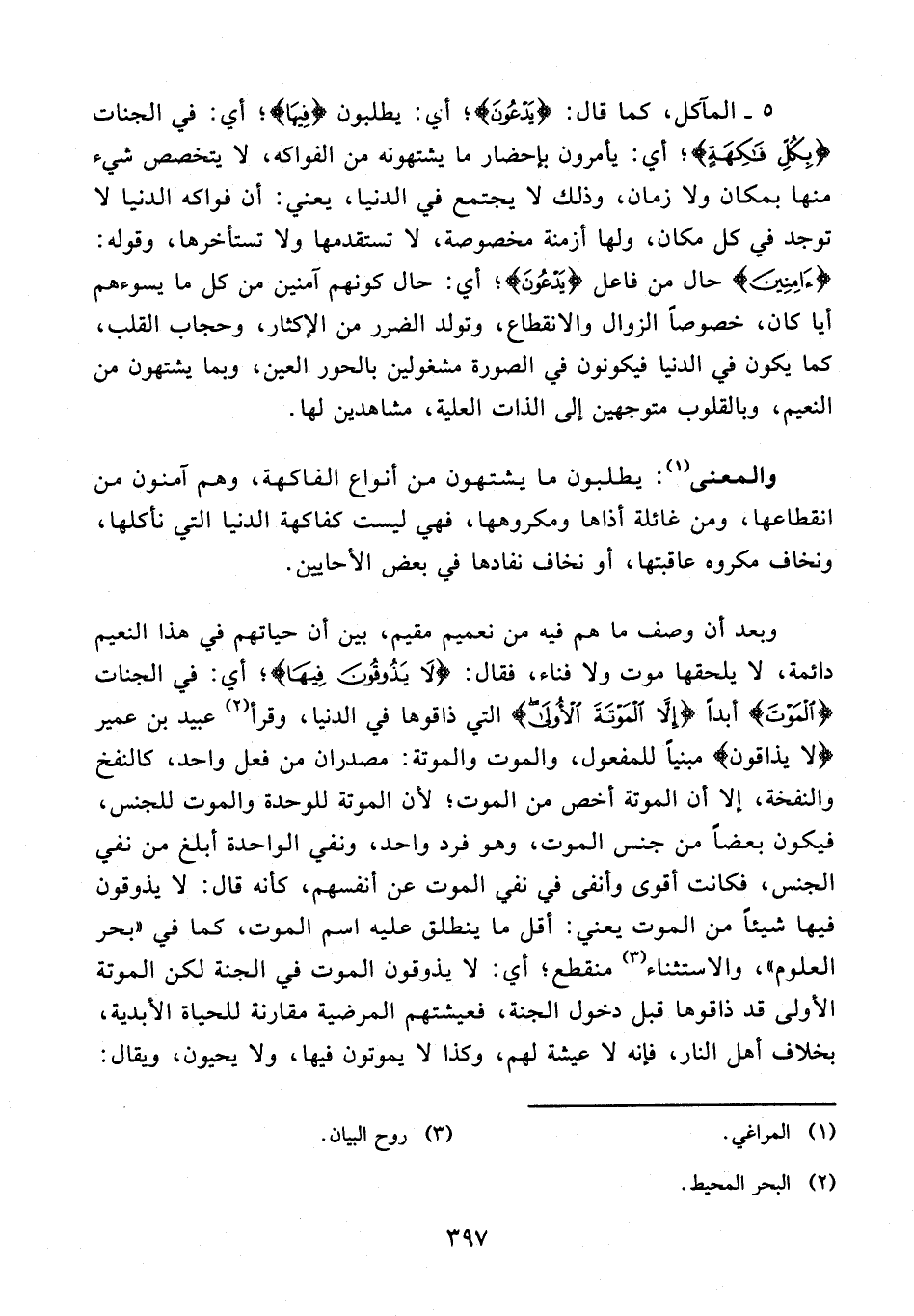 5 - 55 المآكل، كما قال: {يَدْعُونَ}؛ أي: يطلبون {فِيهَا}؛ أي: في الجنات {بِكُلِّ فَاكِهَةٍ}؛ أي: يأمرون بإحضار ما يشتهونه من الفواكه، لا يتخصص شيء منها بمكان ولا زمان، وذلك لا يجتمع في الدنيا، يعني: أن فواكه الدنيا لا توجد في كل مكان، ولها أزمنة مخصوصة، لا تستقدمها ولا تستأخرها، وقوله: {آمِنِينَ} حال من فاعل {يَدْعُونَ}؛ أي: حال كونهم آمنين من كل ما يسوءهم أيا كان، خصوصًا الزوال والانقطاع، وتولد الضرر من الإكثار، وحجاب القلب، كما يكون في الدنيا فيكونون في الصورة مشغولين بالحور العين، وبما يشتهون من النعيم، وبالقلوب متوجهين إلى الذات العلية، مشاهدين لها.