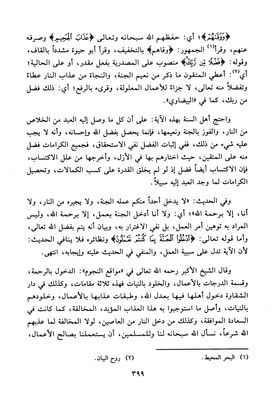 وفي الحديث: "لا يدخل أحدًا منكم عمله الجنة، ولا يجيره من النار، ولا أنا، إلا برحمة الله"؛ أي: ولا أنا أدخل الجنة بعمل، إلا برحمة الله، وليس المراد به توهين أمر العمل، بل نفي الاغترار به، وبيان أنه يتم بفضل الله تعالى، وأما قوله تعالى: {ادْخُلُوا الْجَنَّةَ بِمَا كُنْتُمْ تَعْمَلُونَ} ونظائره فلا ينافي الحديث: لأن الآية تدل على سببية العمل، والمنفي في الحديث عليته وإيجابه، انتهى.