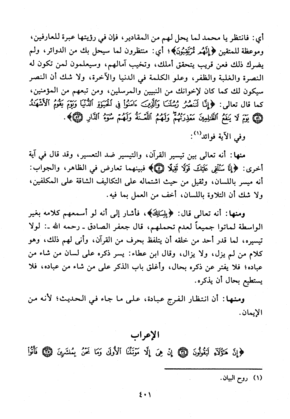 ومنها: أنه تعالى قال: {بِلِسَانِكَ}، فأشار إلى أنه لو أسمعهم كلامه بغير الواسطة لماتوا جميعًا لعدم تحملهم، قال جعفر الصادق - رحمه الله -: لولا تيسيره، لما قدر أحد من خلقه أن يتلفظ بحرف من القران، وأنى لهم ذلك، وهو كلام من لم يزل، ولا يزال، وقال ابن عطاء: يسر ذكره على لسان من شاء من عباده؛ فلا يفتر عن ذكره بحال، وأغلق باب الذكر على من شاء من عباده، فلا يستطيع بحال أن يذكره.