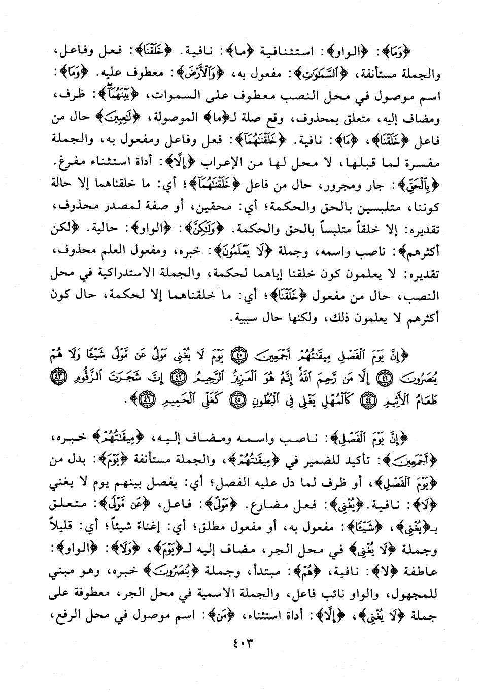 {إِنَّ يَوْمَ الْفَصْلِ}: ناصب واسمه ومضاف إليه، {مِيقَاتُهُمْ} خبره، {أَجْمَعِينَ}: تأكيد للضمير في {مِيقَاتُهُمْ}، والجملة مستأنفة {يَوْمَ}: بدل من {يَوْمَ الْفَصْلِ}، أو ظرف لما دل عليه الفصل؛ أي: يفصل بينهم يوم لا يغني {لَا}: نافية. {يُغْنِي}: فعل مضارع. {مَوْلًى}: فاعل، {عَنْ مَوْلًى}: متعلق بـ {يُغْنِي}، {شَيْئًا}: مفعول به، أو مفعول مطلق؛ أي: إغناءً شيئًا؛ أي: قليلًا وجملة {لَا يُغْنِي} في محل الجر، مضاف إليه لـ {يَوْمَ}، {وَلَا}: {الواو}: عاطفة {لا} نافية، {هُمّ}: مبتدأ، وجملة {يُنْصَرُونَ} خبره، وهو مبني للمجهول، والواو نائب فاعل، والجملة الاسمية في محل الجر، معطوفة على جملة {لَا يُغْنِي}، {إِلَّا}: أداة استثناء، {مَن}: اسم موصول في محل الرفع،