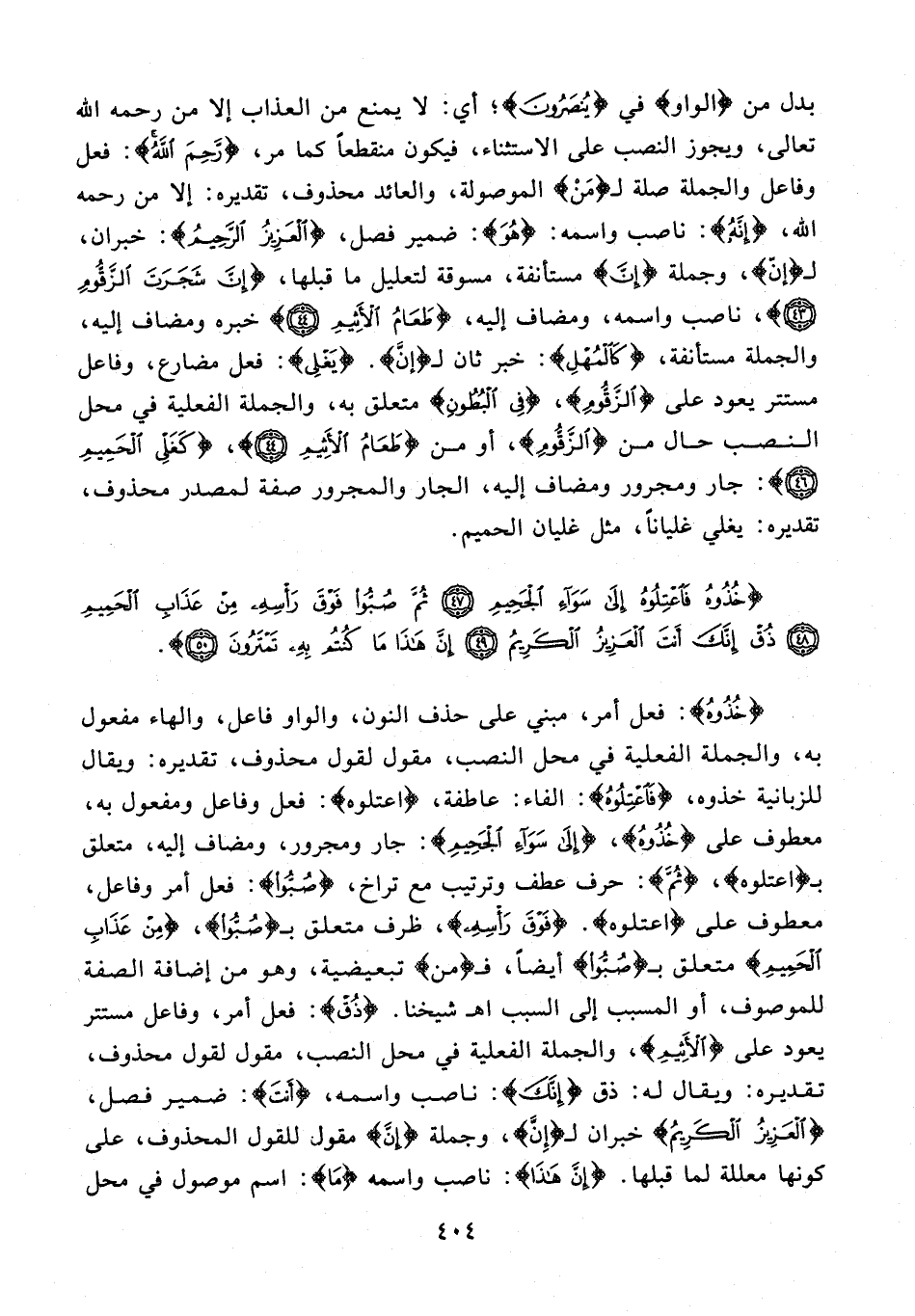 {خُذُوهُ}: فعل أمر، مبني على حذف النون، والواو فاعل، والهاء مفعول به، والجملة الفعلية في حل النصب، مقول لقول محذوف، تقديره: ويقال للزبانية خذوه، {فَاعْتِلُوهُ}: الفاء: عاطفة، {اعتلوه}: فعل وفاعل ومفعول به، معطوف على {خُذُوُهُ}، {إِلَى سَوَاءِ الْجَحِيمِ}: جار ومجرور، ومضاف إليه، متعلق بـ {اعتلوه}، {ثُمَّ}: حرف عطف وترتيب مع تراخ، {صُبُّوا}: فعل أمر وفاعل، معطوف على {اعتلوه}. {فَوْقَ رَأْسِهِ}، ظرف متعلق بـ {صُبُّوا}، {مِنْ عَذَابِ الْحَمِيمِ} متعلق بـ {صُبُّوا} أيضًا، فـ {من} تبعيضية، وهو من إضافة الصفة للموصوف، أو المسبب إلى السبب اهـ شيخنا. {ذُقَّ}: فعل أمر، وفاعل مستتر يعود على {الْأَثِيمِ}، والجملة الفعلية في محل النصب، مقول لقول محذوف، تقديره: ويقال له: ذق {إِنَّكَ}: ناصب واسمه، {أَنتَ}: ضمير فصل، {الْعَزِيزُ الْكَرِيمُ} خبران لـ {إِنَّ}، وجملة {إنَّ} مقول للقول المحذوف، على كونها معللة لما قبلها. {إِنَّ هَذَا}: ناصب واسمه {مَا}: اسم موصول في محل