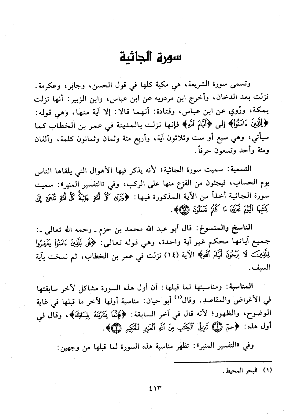 وتسمى سورة الشريعة، هي مكية كلها في قول الحسن، وجابر، وعكرمة. نزلت بعد الدخان، وأخرج ابن مردويه عن ابن عباس، وابن الزبير: أنها نزلت بمكة، ورُوي عن ابن عباس، وقتادة: أنهما قالا: إلا آية منها، وهي قوله: {لِلَّذِينَ آمَنُوا} إلى {أَيَّامَ اللَّهِ} فإنها نزلت بالمدينة في عمر بن الخطاب كما سيأتي، وهي سبع أو ست وثلاثون آية، وأربع مئة وثمان وثمانون كلمة، وألفان ومئة واحد وتسعون حرفًا.