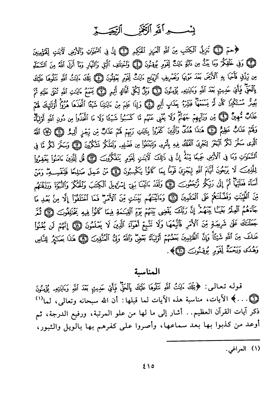{حم (1) تَنْزِيلُ الْكِتَابِ مِنَ اللَّهِ الْعَزِيزِ الْحَكِيمِ (2) إِنَّ فِي السَّمَاوَاتِ وَالْأَرْضِ لَآيَاتٍ لِلْمُؤْمِنِينَ (3) وَفِي خَلْقِكُمْ وَمَا يَبُثُّ مِنْ دَابَّةٍ آيَاتٌ لِقَوْمٍ يُوقِنُونَ (4) وَاخْتِلَافِ اللَّيْلِ وَالنَّهَارِ وَمَا أَنْزَلَ اللَّهُ مِنَ السَّمَاءِ مِنْ رِزْقٍ فَأَحْيَا بِهِ الْأَرْضَ بَعْدَ مَوْتِهَا وَتَصْرِيفِ الرِّيَاحِ آيَاتٌ لِقَوْمٍ يَعْقِلُونَ (5) تِلْكَ آيَاتُ اللَّهِ نَتْلُوهَا عَلَيْكَ بِالْحَقِّ فَبِأَيِّ حَدِيثٍ بَعْدَ اللَّهِ وَآيَاتِهِ يُؤْمِنُونَ (6) وَيْلٌ لِكُلِّ أَفَّاكٍ أَثِيمٍ (7) يَسْمَعُ آيَاتِ اللَّهِ تُتْلَى عَلَيْهِ ثُمَّ يُصِرُّ مُسْتَكْبِرًا كَأَنْ لَمْ يَسْمَعْهَا فَبَشِّرْهُ بِعَذَابٍ أَلِيمٍ (8) وَإِذَا عَلِمَ مِنْ آيَاتِنَا شَيْئًا اتَّخَذَهَا هُزُوًا أُولَئِكَ لَهُمْ عَذَابٌ مُهِينٌ (9) مِنْ وَرَائِهِمْ جَهَنَّمُ وَلَا يُغْنِي عَنْهُمْ مَا كَسَبُوا شَيْئًا وَلَا مَا اتَّخَذُوا مِنْ دُونِ اللَّهِ أَوْلِيَاءَ وَلَهُمْ عَذَابٌ عَظِيمٌ (10) هَذَا هُدًى وَالَّذِينَ كَفَرُوا بِآيَاتِ رَبِّهِمْ لَهُمْ عَذَابٌ مِنْ رِجْزٍ أَلِيمٌ (11) اللَّهُ الَّذِي سَخَّرَ لَكُمُ الْبَحْرَ لِتَجْرِيَ الْفُلْكُ فِيهِ بِأَمْرِهِ وَلِتَبْتَغُوا مِنْ فَضْلِهِ وَلَعَلَّكُمْ تَشْكُرُونَ (12) وَسَخَّرَ لَكُمْ مَا فِي السَّمَاوَاتِ وَمَا فِي الْأَرْضِ جَمِيعًا مِنْهُ إِنَّ فِي ذَلِكَ لَآيَاتٍ لِقَوْمٍ يَتَفَكَّرُونَ (13) قُلْ لِلَّذِينَ آمَنُوا يَغْفِرُوا لِلَّذِينَ لَا يَرْجُونَ أَيَّامَ اللَّهِ لِيَجْزِيَ قَوْمًا بِمَا كَانُوا يَكْسِبُونَ (14) مَنْ عَمِلَ صَالِحًا فَلِنَفْسِهِ وَمَنْ أَسَاءَ فَعَلَيْهَا ثُمَّ إِلَى رَبِّكُمْ تُرْجَعُونَ (15) وَلَقَدْ آتَيْنَا بَنِي إِسْرَائِيلَ الْكِتَابَ وَالْحُكْمَ وَالنُّبُوَّةَ وَرَزَقْنَاهُمْ مِنَ الطَّيِّبَاتِ وَفَضَّلْنَاهُمْ عَلَى الْعَالَمِينَ (16) وَآتَيْنَاهُمْ بَيِّنَاتٍ مِنَ الْأَمْرِ فَمَا اخْتَلَفُوا إِلَّا مِنْ بَعْدِ مَا جَاءَهُمُ الْعِلْمُ بَغْيًا بَيْنَهُمْ إِنَّ رَبَّكَ يَقْضِي بَيْنَهُمْ يَوْمَ الْقِيَامَةِ فِيمَا كَانُوا فِيهِ يَخْتَلِفُونَ (17) ثُمَّ جَعَلْنَاكَ عَلَى شَرِيعَةٍ مِنَ الْأَمْرِ فَاتَّبِعْهَا وَلَا تَتَّبِعْ أَهْوَاءَ الَّذِينَ لَا يَعْلَمُونَ (18) إِنَّهُمْ لَنْ يُغْنُوا عَنْكَ مِنَ اللَّهِ شَيْئًا وَإِنَّ الظَّالِمِينَ بَعْضُهُمْ أَوْلِيَاءُ بَعْضٍ وَاللَّهُ وَلِيُّ الْمُتَّقِينَ (19) هَذَا بَصَائِرُ لِلنَّاسِ وَهُدًى وَرَحْمَةٌ لِقَوْمٍ يُوقِنُونَ (20)}.