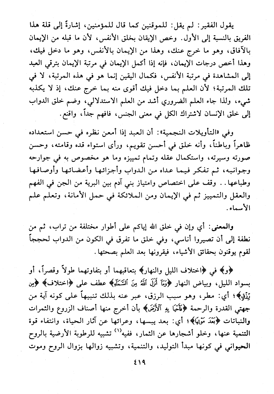 وفي "التأويلات النجمية": أن العبد إذا أمعن نظره في حسن استعداده ظاهرًا وباطنًا، وأنه خلق في أحسن تقويم، ورأى استواء قده وقامته، وحسن صورته وسيرته، واستكمال عقله وتمام تمييزه وما هو مخصوص به في جوارحه وجوانبه، ثم تفكر فيما عداه من الدواب وأجزائها وأعضائها وأوصافها وطباعها .. وقف على اختصاص وامتياز بني آدم بين البرية من الجن في الفهم والعقل والتمييز ثم في الإيمان ومن الملائكة في حمل الأمانة، وتعلم علم الأسماء.