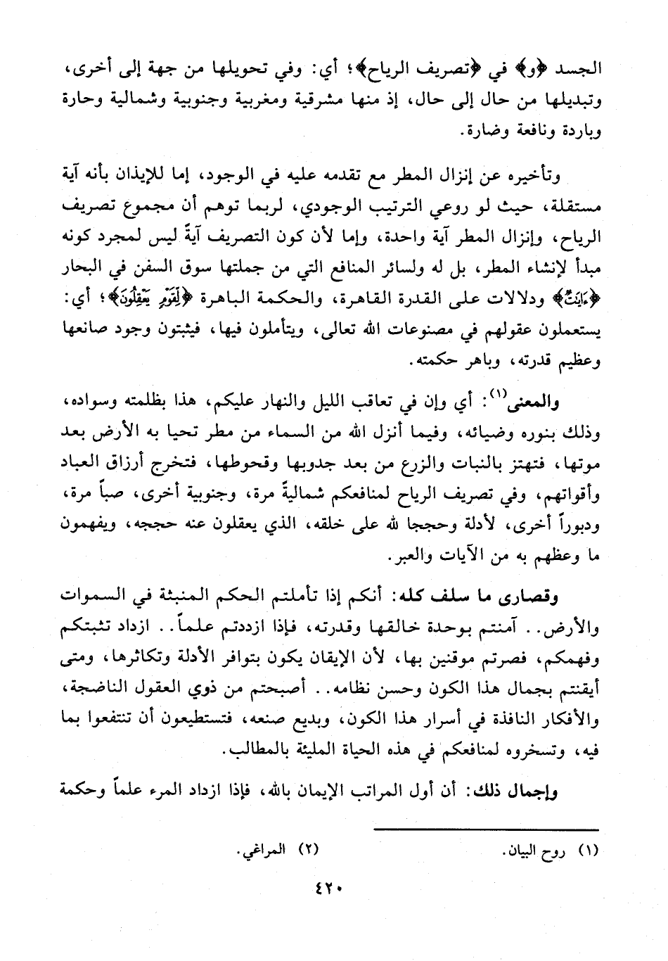 وتأخيره عن إنزال المطر مع تقدمه عليه في الوجود، إما للإيذان بأنه آية مستقلة، حيث لو روعي الترتيب الوجودي، لربما توهم أن مجموع تصريف الرياح، وإنزال المطر آية واحدة، وإما لأن كون التصريف آيةً ليس لمجرد كونه مبدا لإنشاء المطر، بل له ولسائر المنافع التي من جملتها سوق السفن في البحار {آيَاتٌ} ودلالات على القدرة القاهرة، والحكمة الباهرة {لِقَوْمٍ يَعْقِلُونَ}؛ أي: يستعملون عقولهم في مصنوعات الله تعالى، ويتأملون فيها، فيثبتون وجود صانعا وعظيم قدرته، وباهر حكمته.