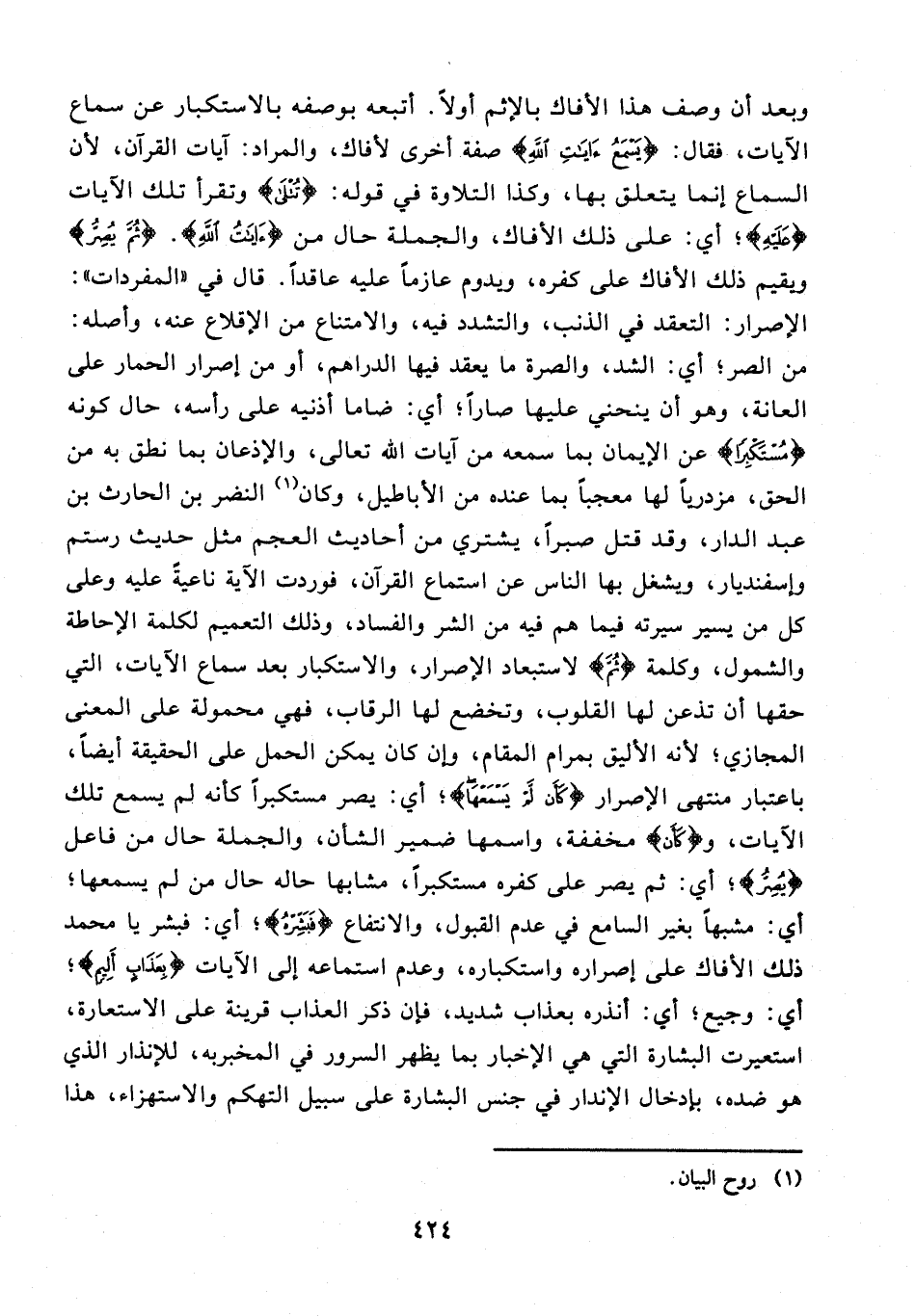 8 - وبعد أن وصف ذا الأفاك بالإثم أولًا. أتبعه بوصفه بالاستكبار عن سماع الآيات، فقال: {يَسْمَعُ آيَاتِ اللَّهِ} صفة أخرى لأفاك، والمراد: آيات القرآن؛ لأن السماع إنما يتعلق بها، وكذا التلاوة في قوله: {تُتْلَى} وتقرأ تلك الآيات {عَلَيْهِ}؛ أي: على ذلك الأفاك، والجملة حال من {آيَاتِ اللَّهِ}. {ثُمَّ يُصِرُّ} ويقيم ذلك الأفاك على كفره، ويدوم عازمًا عليه عاقدًا. قال في "المفردات": الإصرار: التعقد في الذنب، والتشدد فيه، والامتناع من الإقلاع عنه، وأصله: من الصر؛ أي: الشد، والصرة ما يعقد فيها الدراهم، أو من إصرار الحمار على العانة، وهو أن ينحني عليها صارًا؛ أي: ضاما أذنيه على رأسه، حال كونه {مُسْتَكْبِرًا} عن الإيمان بما سمعه من آيات الله تعالى، والإذعان بما نطق به من الحق، مزدريًا لها معجبًا بما عنده من الأباطيل، وكان (¬1) النضر بن الحارث بن عبد الدار، وقد قتل صبرًا، يشتري من أحاديث العجم مثل حديث رستم وإسفنديار، ويشغل بها الناس عن استماع القرآن، فوردت الآية ناعيةً عليه وعلى كل من يسير سيرته فيما هم فيه من الشر والفساد، وذلك التعميم لكلمة الإحاطة والشمول، وكلمة {ثُمَّ} لاستبعاد الإصرار، والاستكبار بعد سماع الآيات، التي حقها أن تذعن لها القلوب، وتخضع لها الرقاب، فهي محمولة على المعنى المجازي؛ لأنه الأليق بمرام المقام، وإن كان يمكن العمل على الحقيقة أيضًا، باعتبار منتهى الإصرار {كَأَنْ لَمْ يَسْمَعْهَا}؛ أي: يصر مستكبرًا كأنه لم يسمع تلك الآيات، و {كَأَنْ} مخففة، واسمها ضمير الشأن، والجملة حال من فاعل {يُصِرُّ}؛ أي: ثم يصر على كفره مستكبرًا، مشابها حاله حال من لم يسمعها؛ أي: مشبهًا بغير السامع في عدم القبول، والانتفاع {فَبَشِّرْهُ}؛ أي: فبشر يا محمد ذلك الأفاك على إصراره واستكباره، وعدم استماعه إلى الآيات {بِعَذَابٍ أَلِيمٍ}؛ أي: وجيع؛ أي: أنذره بعذاب شديد، فإن ذكر العذاب قرينة على الاستعارة، استعيرت البشارة التي هي الإخبار بما يظهر السرور في المخبر به، للإنذار الذي هو ضده، بدخال الإندار في جنس البشارة على سبيل التهكم والاستهزاء، هذا