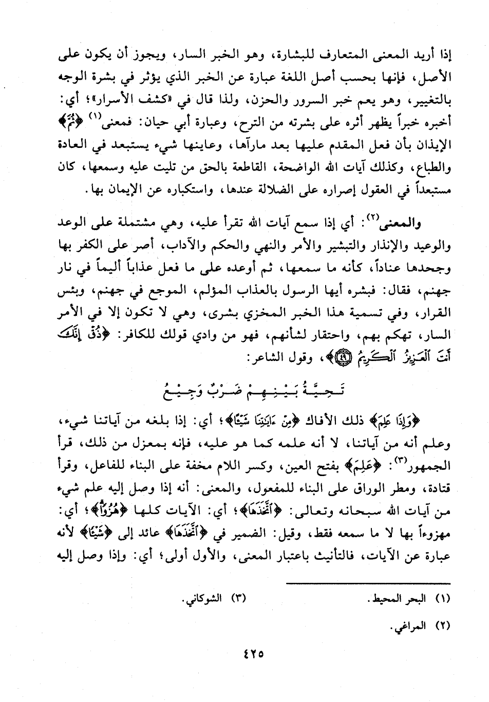 إذا أريد المعنى المتعارف للبشارة، وهو الخبر السار، ويجوز أن يكون على الأصل، فإنها بحسب أصل اللغة عبارة عن الخبر الذي يؤثر في بشرة الوجه بالتغيير، وهو يعم خبر السرور والحزن، ولذا قال في "كشف الأسرار"؛ أي: أخبره خبرًا يظهر أثره على بشرته من الترح، وعبارة أبي حيان: فمعنى (¬1) {ثُمَّ}، الإيذان بأن فعل المقدم عليها بعدما رآها، وعاينها شيء يستبعد في العادة والطباع، وكذلك آيات الله الواضحة، القاطعة بالحق من تليت عليه وسمعها، كان مستبعدًا في العقول إصراره على الضلالة عندها، واستكباره عن الإيمان بها.