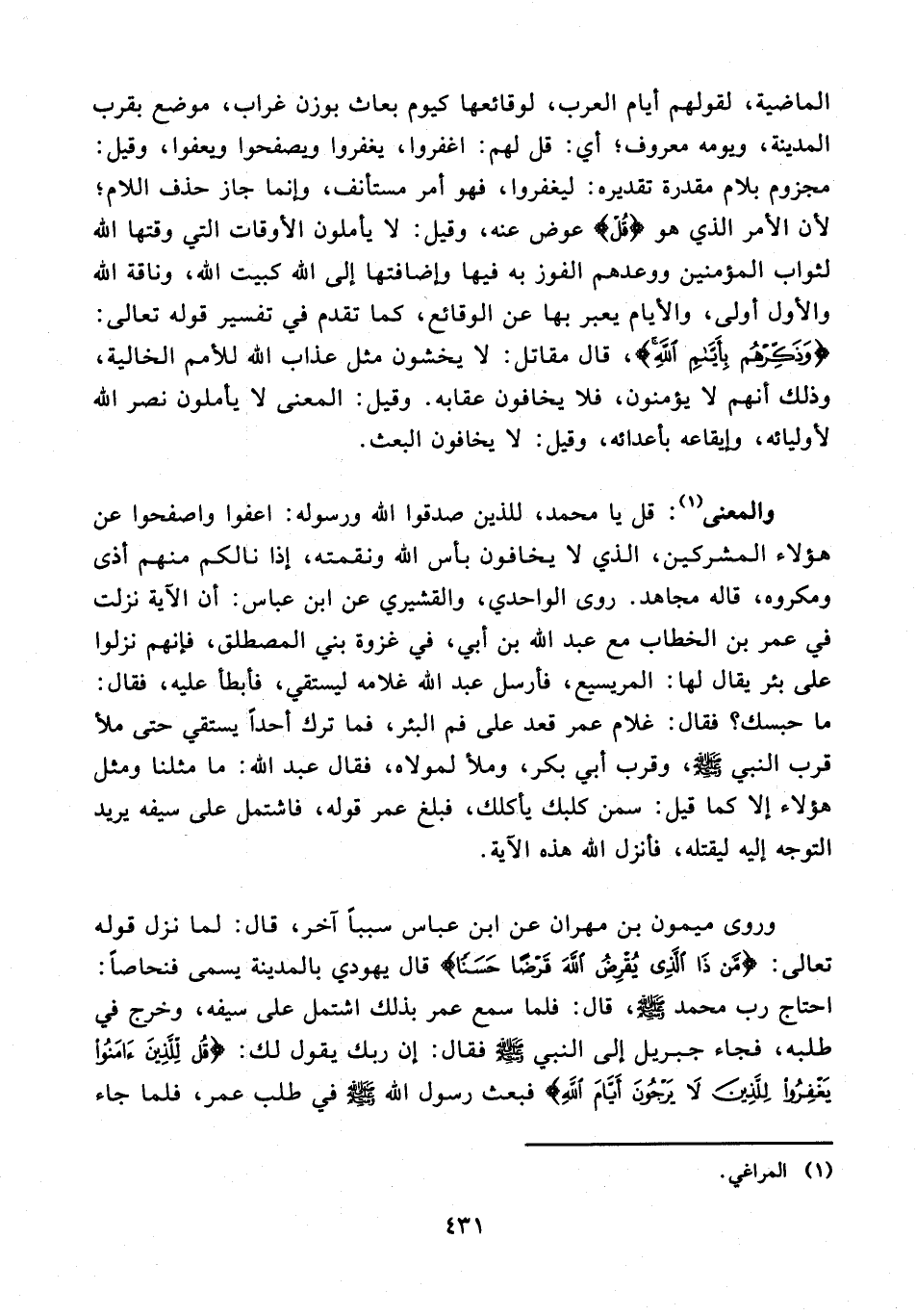 والمعنى (¬1): قل يا محمد، للذين صدقوا الله ورسوله: اعفوا واصفحوا عن هؤلاء المشركين، الذي لا يخافون بأس الله ونقمته، إذا نالكم منهم أذى ومكروه، قاله مجاهد. روى الواحدي، والقشيري عن ابن عباس: أن الآية نزلت في عمر بن الخطاب مع عبد الله بن أبي، في غزوة بني المصطلق، فإنهم نزلوا على بئر يقال لها: المريسيع، فأرسل عبد الله غلامه ليستقي، فأبطأ عليه، فقال: ما حبسك؟ فقال: غلام عمر قعد على فم البئر، فما ترك أحدًا يستقي حتى ملأ قرب النبي - صلى الله عليه وسلم -، وقرب أبي بكر، وملأ لمولاه، فقال عبد الله: ما مثلنا ومئل هؤلاء إلا كما قيل: سمن كلبك يأكلك، فبلغ عمر قوله، فاشتمل على سيفه يريد التوجه إليه ليقتله، فأنزل الله هذه الآية.