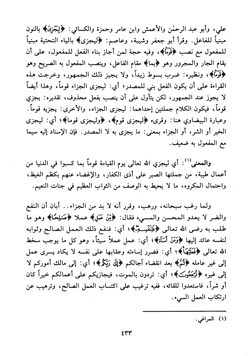 علي، وأبو عبد الرحمن والأعمش وابن عامر وحمزة والكسائي: {لِيَجْزِيَ} بالنون مبنيًا للفاعل. وقرأ أبو جعفر وشيبة، وعاصم: {ليجزى} بالياء التحتية مبنيًا للمفعول مع نصب {قَوْمًا}، وفيه حجة لمن أجاز بناء الفعل للمفعول، على أن يقام الجار والمجرور وهو {بما} مقام الفاعل، وينصب المفعول به الصريح وهو {قَوْمًا}، ونظيره: ضرب بسوط زيدًا، ولا يجيز ذلك الجمهور، وخرجت هذه القراءة على أن يكون الفعل بني للمصدر؛ أي: ليجزى الجزاء قومًا، وهذا أيضًا لا يجوز عند الجمهور، لكن يتأول على أن ينصب بفعل محذوف، تقديره: يجزي قومًا، فيكون الكلام جملتين إحداهما: ليجزى الجزاء، والأخرى: يجزيه قومًا. وعبارة البيضاوي هنا: وقرىء {ليجزى قوم}، {وليجزى قوما}؛ أي: ليجزى الخير أو الشر، أو الجزاء بمعنى: ما يجزى به لا المصدر. فإن الإسناد إليه سيما مع المفعول به ضعيف.