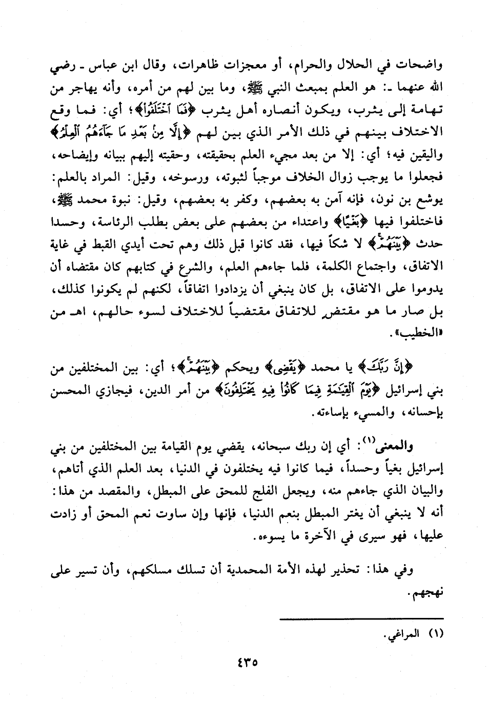 والمعنى (¬1): أي إن ربك سبحانه، يقضي يوم القيامة بين المختلفين من بني إسرائيل بغيًا وحسدًا، فيما كانوا فيه يختلفون في الدنيا، بعد العلم الذي أتاهم، والبيان الذي جاءهم منه، ويجعل الفلج للمحق على المبطل، والمقصد من هذا: أنه لا ينبغي أن يغتر المبطل بنعم الدنيا، فإنها وإن ساوت نعم المحق أو زادت عليها، فهو سيرى في الآخرة ما يسوءه.