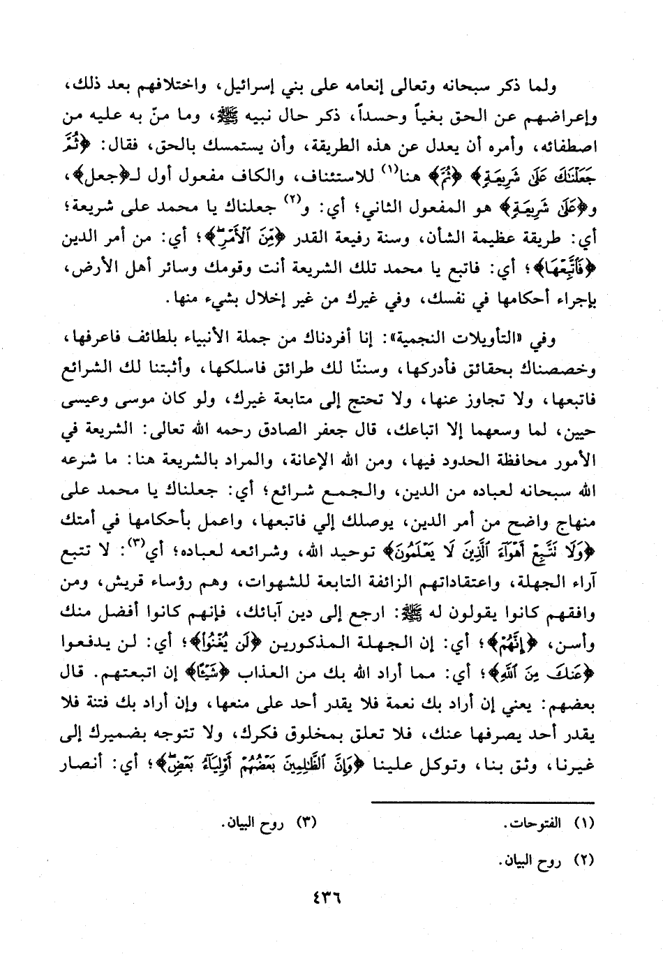 وفي "التأويلات النجمية": إنا أفردناك من جملة الأنبياء بلطائف فاعرفها، وخصصناك بحقائق فأدركها، وسننّا لك طرائق فاسلكها، وأثبتنا لك الشرائع فاتبعها، ولا تجاوز عنها، ولا تحتج إلى متابعة غيرك، ولو كان موسى وعيسى حيين، لما وسعهما إلا اتباعك، قال جعفر الصادق رحمه الله تعالى: الشريعة في الأمور محافظة الحدود فيها، ومن الله الإعانة، والمراد بالشريعة هنا: ما شرعه الله سبحانه لعباده من الدين، والجمع شرائع؛ أي: جعلناك يا محمد على منهاج واضح من أمر الدين، يوصلك إلى فاتبعها، واعمل بأحكامها في أمتك {وَلَا تَتَّبِعْ أَهْوَاءَ الَّذِينَ لَا يَعْلَمُونَ} توحيد الله، وشرانعه لعباده؛ أي (¬3): لا تتبع آراء الجهلة، واعتقاداتهم الزائفة التابعة للشهوات، وهم رؤساء قريش، ومن وافقهم كانوا يقولون له - صلى الله عليه وسلم -: ارجع إلى دين آبائك، فإنهم كانوا أفضل منك وأسن،