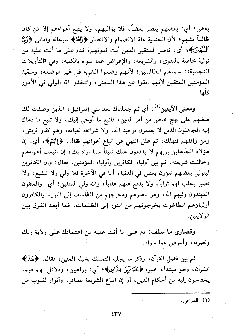 ومعنى الآيتين (¬1): أي ثم جعلناك بعد بني إسرائيل، الذين وصفت لك صفتهم على نهج خاص من أمر الدين، فاتبع ما أوحى إليك، ولا تتبع ما دعاك إليه الجاهلون الذين لا يعلمون توحيد الله، ولا شرائعه لعباده، وهم كفار قريش، ومن وافقهم فتهلك، ثم علل النهي عن اتباع أهوائهم فقال: {إِنَّهُمْ}؛ أي: إن هؤلاء الجاهلين بربهم لا يدفعون عنك شيئًا مما أراد بك، إن اتبعت أهواءهم وخالفت شريعته، ثم بين أولياء الكافرين وأولياء المؤمنين، فقال: وإن الكافرين ليتولى بعضهم شؤون بعض في الدنيا، أما في الآخرة فلا ولي ولا شفيع، ولا نصير يجلب لهم ثوابًا، ولا يدفع عنهم عقابًا، والله ولي المتقين؛ أي: والمتقون المهتدون وليهم الله، وهو ناصرهم ومخرجهم من الظلمات إلى النور، والكافرون أولياؤهم الطاغوت يخرجونهم من النور إلى الظلمات، فما أبعد الفرق بين الولايتين.