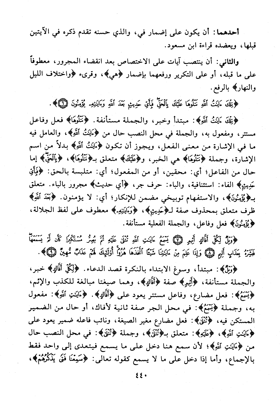 {وَيْلٌ}: مبتدأ، وسوغ الابتداء بالنكرة قصد الدعاء. {لِكُلِّ أَفَّاكٍ} خبر، والجملة مستأنفة، {أَثِيمٍ} صفة {أَفَّاكٍ}، وهما صيغتا مبالغة للكذب والإثم، {يَسْمَعُ}: فعل مضارع، وفاعل مستتر يعود على {أَفَّاكٍ}. {آيَاتِ اللَّهِ}: مفعول به، وجملة {يَسْمَعُ}: في محل الجر صفة ثانية لأفاك، أو حال من الضمير المستكن فيه، {تُتْلَى}: فعل مضارع مغير الصيغة، ونائب فاعله ضمير يعود على {آيَاتِ اللَّهِ}، {عَلَيْهِ}: متعلق بـ {تُتْلَى}، وجملة {تُتْلَى}: في محل النصب حال من {آيَاتِ اللَّهِ}؛ لأن سمع هنا دخل على ما يسمع فيتعدى إلى واحد فقط بالإجماع، وأما إذا دخل على ما لا يسمع كقوله تعالى: {سَمِعْنَا فَتًى يَذْكُرُهُمْ}،
