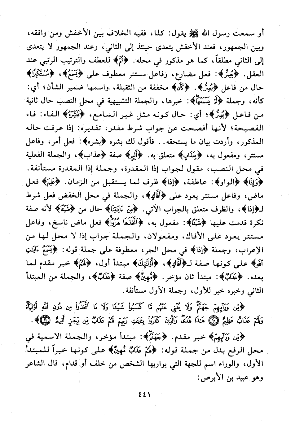 أو سمعت رسول الله - صلى الله عليه وسلم - يقول: كذا، ففيه الخلاف بين الأخفش ومن وافقه، وبين الجمهور، فعند الأخفش يتعدى حينئذ إلى الثاني، وعند الجمهور لا يتعدى إلى الثاني مطلقًا، كما هو مذكور في محله. {ثُمَّ} للعطف والترتيب الرتبي عند العقل. {يُصِرُّ}: فعل مضارع، وفاعل مستتر معطوف على {يَسْمَعُ}، {مُسْتَكْبِرًا} حال من فاعل {يُصِرُّ}. {كَأَنْ} مخففة من الثقيلة، واسمها ضمير الشأن؛ أي: كأنه، وجملة {لَمْ يَسْمَعْهَا}: خبرها، والجملة التشبيهية في محل النصب حال ثانية من فاعل {يُصِرُّ}؛ أي: حال كونه مثل غير السامع، {فَبَشِّرْهُ} الفاء: فاء الفصيحة؛ لأنها أفصحت عن جواب شرط مقدر، تقديره: إذا عرفت حاله المذكور، وأردت بيان ما يستحقه .. فأقول لك بشره {بشره}: فعل أمر، وفاعل مستتر، ومفعول به، {بِعَذَابٍ} متعلق به. {أَلِيمٍ} صفة {عذاب}، والجملة الفعلية في محل النصب، مقول لجواب إذا المقدرة، وجملة إذا المقدرة مستأنفة. {وَإِذَا} {الواو}: عاطفة، {إذا} ظرف لما يستقبل من الزمان. {عَلِمَ} فعل ماض، وفاعل مستتر يعود على {أَفَّاكٍ}، والجملة في محل الخفض فعل شرط لـ {إذا}، والظرف متعلق بالجواب الآتي. {مِنْ آيَاتِنَا} حال من {شَيْئًا} لأنه صفة نكرة قدمت عليها {شَيْئًا}: مفعول به، {اتَّخَذَهَا هُزُوًا} فعل ماض ناسخ، وفاعل مستتر يعود على الأفاك، ومفعولان، والجملة جواب إذا لا محل لها من الإعراب، وجملة {إذا} في محل الجر، معطوفة على جملة قوله: {يَسْمَعُ آيَاتِ اللَّهِ} على كونها صفة لـ {أَفَّاكٍ}، {أُولَئِكَ} مبتدأ أول، {لَهُمْ} خبر مقدم لما بعده. {عَذَابٌ}: مبتدأ ثان مؤخر. {مُهِينٌ} صفة {عَذَابٌ}، والجملة من المبتدأ الثاني وخبره خبر للأول، وجملة الأول مستأنفة.
