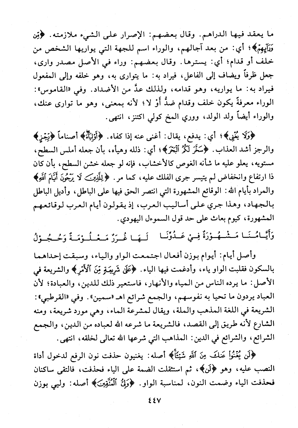 {وَلَا يُغْنِي}؛ أي: يدفع، يقال: أغنى عنه إذا كفاه. {أَوْلِيَاءَ} أصنامًا {رِجْزٍ} والرجز أشد العذاب. {سَخَّرَ لَكُمُ الْبَحْرَ}؛ أي: ذلَله وهيأه، بأن جعله أملس السطح، مستويه، يعلو عليه ما شأنه الغوص كالأخشاب، فإنه لو جعله خشن السطح، بأن كان ذا ارتفاع وانخفاض لم يتيسر جرى الفلك عليه، كما مر. {لِلَّذِينَ لَا يَرْجُونَ أَيَّامَ اللَّهِ} والمراد بأيام الله: الوقائع المشهورة التي انتصر الحق فيها على الباطل، وأديل الباطل بالجهاد، وهذا جري على أساليب العرب، إذ يقولون أيام العرب لوقائعهم المشهورة، كيوم بعاث على حد قول السموءل اليهودي.