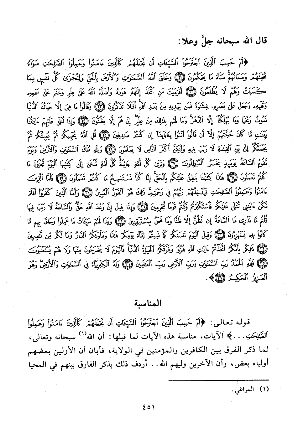 {أَمْ حَسِبَ الَّذِينَ اجْتَرَحُوا السَّيِّئَاتِ أَنْ نَجْعَلَهُمْ كَالَّذِينَ آمَنُوا وَعَمِلُوا الصَّالِحَاتِ سَوَاءً مَحْيَاهُمْ وَمَمَاتُهُمْ سَاءَ مَا يَحْكُمُونَ (21) وَخَلَقَ اللَّهُ السَّمَاوَاتِ وَالْأَرْضَ بِالْحَقِّ وَلِتُجْزَى كُلُّ نَفْسٍ بِمَا كَسَبَتْ وَهُمْ لَا يُظْلَمُونَ (22) أَفَرَأَيْتَ مَنِ اتَّخَذَ إِلَهَهُ هَوَاهُ وَأَضَلَّهُ اللَّهُ عَلَى عِلْمٍ وَخَتَمَ عَلَى سَمْعِهِ وَقَلْبِهِ وَجَعَلَ عَلَى بَصَرِهِ غِشَاوَةً فَمَنْ يَهْدِيهِ مِنْ بَعْدِ اللَّهِ أَفَلَا تَذَكَّرُونَ (23) وَقَالُوا مَا هِيَ إِلَّا حَيَاتُنَا الدُّنْيَا نَمُوتُ وَنَحْيَا وَمَا يُهْلِكُنَا إِلَّا الدَّهْرُ وَمَا لَهُمْ بِذَلِكَ مِنْ عِلْمٍ إِنْ هُمْ إِلَّا يَظُنُّونَ (24) وَإِذَا تُتْلَى عَلَيْهِمْ آيَاتُنَا بَيِّنَاتٍ مَا كَانَ حُجَّتَهُمْ إِلَّا أَنْ قَالُوا ائْتُوا بِآبَائِنَا إِنْ كُنْتُمْ صَادِقِينَ (25) قُلِ اللَّهُ يُحْيِيكُمْ ثُمَّ يُمِيتُكُمْ ثُمَّ يَجْمَعُكُمْ إِلَى يَوْمِ الْقِيَامَةِ لَا رَيْبَ فِيهِ وَلَكِنَّ أَكْثَرَ النَّاسِ لَا يَعْلَمُونَ (26) وَلِلَّهِ مُلْكُ السَّمَاوَاتِ وَالْأَرْضِ وَيَوْمَ تَقُومُ السَّاعَةُ يَوْمَئِذٍ يَخْسَرُ الْمُبْطِلُونَ (27) وَتَرَى كُلَّ أُمَّةٍ جَاثِيَةً كُلُّ أُمَّةٍ تُدْعَى إِلَى كِتَابِهَا الْيَوْمَ تُجْزَوْنَ مَا كُنْتُمْ تَعْمَلُونَ (28) هَذَا كِتَابُنَا يَنْطِقُ عَلَيْكُمْ بِالْحَقِّ إِنَّا كُنَّا نَسْتَنْسِخُ مَا كُنْتُمْ تَعْمَلُونَ (29) فَأَمَّا الَّذِينَ آمَنُوا وَعَمِلُوا الصَّالِحَاتِ فَيُدْخِلُهُمْ رَبُّهُمْ فِي رَحْمَتِهِ ذَلِكَ هُوَ الْفَوْزُ الْمُبِينُ (30) وَأَمَّا الَّذِينَ كَفَرُوا أَفَلَمْ تَكُنْ آيَاتِي تُتْلَى عَلَيْكُمْ فَاسْتَكْبَرْتُمْ وَكُنْتُمْ قَوْمًا مُجْرِمِينَ (31) وَإِذَا قِيلَ إِنَّ وَعْدَ اللَّهِ حَقٌّ وَالسَّاعَةُ لَا رَيْبَ فِيهَا قُلْتُمْ مَا نَدْرِي مَا السَّاعَةُ إِنْ نَظُنُّ إِلَّا ظَنًّا وَمَا نَحْنُ بِمُسْتَيْقِنِينَ (32) وَبَدَا لَهُمْ سَيِّئَاتُ مَا عَمِلُوا وَحَاقَ بِهِمْ مَا كَانُوا بِهِ يَسْتَهْزِئُونَ (33) وَقِيلَ الْيَوْمَ نَنْسَاكُمْ كَمَا نَسِيتُمْ لِقَاءَ يَوْمِكُمْ هَذَا وَمَأْوَاكُمُ النَّارُ وَمَا لَكُمْ مِنْ نَاصِرِينَ (34) ذَلِكُمْ بِأَنَّكُمُ اتَّخَذْتُمْ آيَاتِ اللَّهِ هُزُوًا وَغَرَّتْكُمُ الْحَيَاةُ الدُّنْيَا فَالْيَوْمَ لَا يُخْرَجُونَ مِنْهَا وَلَا هُمْ يُسْتَعْتَبُونَ (35) فَلِلَّهِ الْحَمْدُ رَبِّ السَّمَاوَاتِ وَرَبِّ الْأَرْضِ رَبِّ الْعَالَمِينَ (36) وَلَهُ الْكِبْرِيَاءُ فِي السَّمَاوَاتِ وَالْأَرْضِ وَهُوَ الْعَزِيزُ الْحَكِيمُ (37)}.