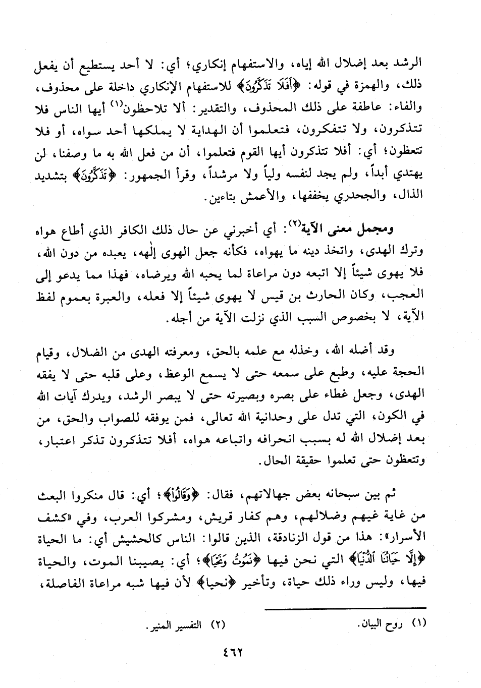 ومجمل معنى الآية (¬2): أي أخبرني عن حال ذلك الكافر الذي أطاع هواه وترك الهدى، واتخذ دينه ما يهواه، فكأنه جعل الهوى إلهه، يعبده من دون الله، فلا يهوى شيئًا إلا اتبعه دون مراعاة لما يحبه الله ويرضاه، فهذا مما يدعو إلى العجب، وكان الحارث بن قيس لا يهوى شيئًا إلا فعله، والعبرة بعموم لفظ الآية، لا بخصوص السبب الذي نزلت الآية من أجله.