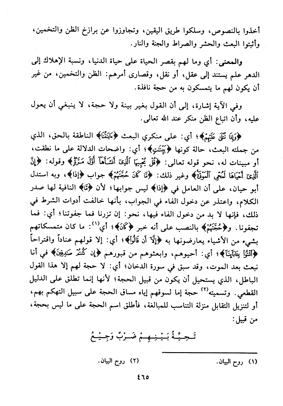 25 - {وَإِذَا تُتْلَى عَلَيْهِمْ}؛ أي: على منكري البعث {آيَاتُنَا} الناطقة بالحق، الذي من جملته البعث، حالة كونها {بَيِّنَاتٍ}؛ أي: واضحات الدلالة على ما نطقت، أو مبينات له، نحو قوله تعالى: {قُلْ يُحْيِيهَا الَّذِي أَنْشَأَهَا أَوَّلَ مَرَّةٍ} وقوله: {إِنَّ الَّذِي أَحْيَاهَا لَمُحْيِ الْمَوْتَى} وغير ذلك: جواب {إِذَا}، وبه استدل أبو حيان، على أن العامل في {إِذَا} ليس جوابها؛ لأن {مَا} النافية لها صدر الكلام، واعتذر عن دخول الفاء في الجواب، بأنها خالفت أدوات الشرط في ذلك، فإنها لا بد من دخول الفاء فيها، نحو: إن تزرنا فما جفوتنا؛ أي: فما تجفونا. و {حُجَّتَهُمْ} بالنصب على أنه خبر {كَانَ}؛ أي (¬1): ما كان متمسكاتهم بشيء من الأشياء يعارضونها به {إِلَّا أَنْ قَالُوا}؛ أي: إلا قولهم عنادًا واقتراحًا {ائْتُوا بِآبَائِنَا}؛ أي: أحيوهم، وابعثوهم من قبورهم {إِنْ كُنْتُمْ صَادِقِينَ} في أنا نبعث بعد الموت، وقد سبق في سورة الدخان؛ أي: لا حجة لهم إلا هذا القول الباطل، الذي يستحيل أن يكون من قبيل الحجة؛ لأنها إنما تطلق على الدليل القطعي. وتسميته (¬2) حجة إما لسوقهم إياه مساق الحجة على سبيل التهكم بهم، أو لتنزيل التقابل منزلة التناسب للمبالغة، فأطلق اسم الحجة على ما ليس بحجة، من قبيل: