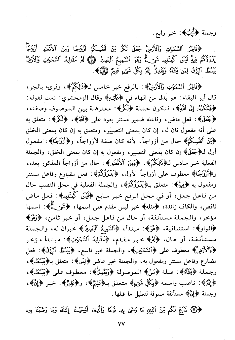{فَاطِرُ السَّمَاوَاتِ وَالْأَرْضِ}: بالرفع خبر خامس لـ {ذَلِكُمُ}، وقرىء بالجر، قال أبو البقاء: هو بدل من الهاء في {عَلَيْهِ} وقال الزمحشري: نعت لقوله: {فَحُكْمُهُ إِلَى اللَّهِ}، فتكون جملة {لَكُمْ}: معترضة بين الموصوف وصفته، {جَعَلَ}: فعل ماض، وفاعله ضمير مستتر يعود على {اللَّهِ}، {لَكُمْ}: متعلق به على أنه مفعول ثان له، إن كان بمعنى التصيير، ومتعلق به إن كان بمعنى الخلق {مِنْ أَنْفُسِكُمْ} حال من أزواجًا؛ لأنه كان صفة لأزواجًا، و {أَزْوَاجًا}: مفعول أول لـ {جَعَلَ} إن كان بمعنى التصيير، ومفعول به إن كان بمعنى الخلق، والجملة الفعلية خبر سادس لـ {ذَلِكُمُ}. {وَمِنَ الْأَنْعَامِ}: حال من أزواجًا المذكور بعده، و {أَزْوَاجًا} معطوف على أزواجًا الأول، {يَذْرَؤُكُمْ}: فعل مضارع وفاعل مستتر ومفعول به {فِيهِ}: متعلق بـ {يَذْرَؤُكُمْ}، والجملة الفعلية في محل النصب حال من فاعل جعل، أو في محل الرفع خبر سابع {لَيْسَ كَمِثْلِهِ}: فعل ماض ناقص، والكاف زائدة، {مِثْلِهِ} خبر ليس مقدم على اسمها، {شَيْءٌ}: اسمها مؤخر، والجملة مستأنفة، أو حال من فاعل جعل، أو خبر ثامن، {وَهُو} {الواو}: استئنافية، {هُو}: مبتدأ، {السَّمِيعُ الْبَصِيرُ} خبران له، والجملة مستأنفة، أو حال، {لَهُ} خبر مقدم، {مَقَالِيدُ السَّمَاوَاتِ}: مبتدأ مؤخر {وَالْأَرْضِ} معطوف على {السَّمَاوَاتِ}، والجملة خبر تاسع، {يَبْسُطُ الرِّزْقَ}: فعل مضارع وفاعل مستتر ومفعول به، والجملة خبر عاشر {لِمَنْ}: متعلق بـ {يَبْسُطُ}، وجملة {يَشَاءُ}: صلة {مَنْ} الموصولة {وَيَقْدِرُ}: معطوف على {يَبْسُطُ}، {إِنَّهُ}: ناصب واسمه {بِكُلِّ شَيْءٍ} متعلق بـ {عَلِيمٌ}، و {عَلِيمٌ}: خبر {إنَّ}، وجملة {إنَّ} مستأنفة مسوقة لتعليل ما قبلها.