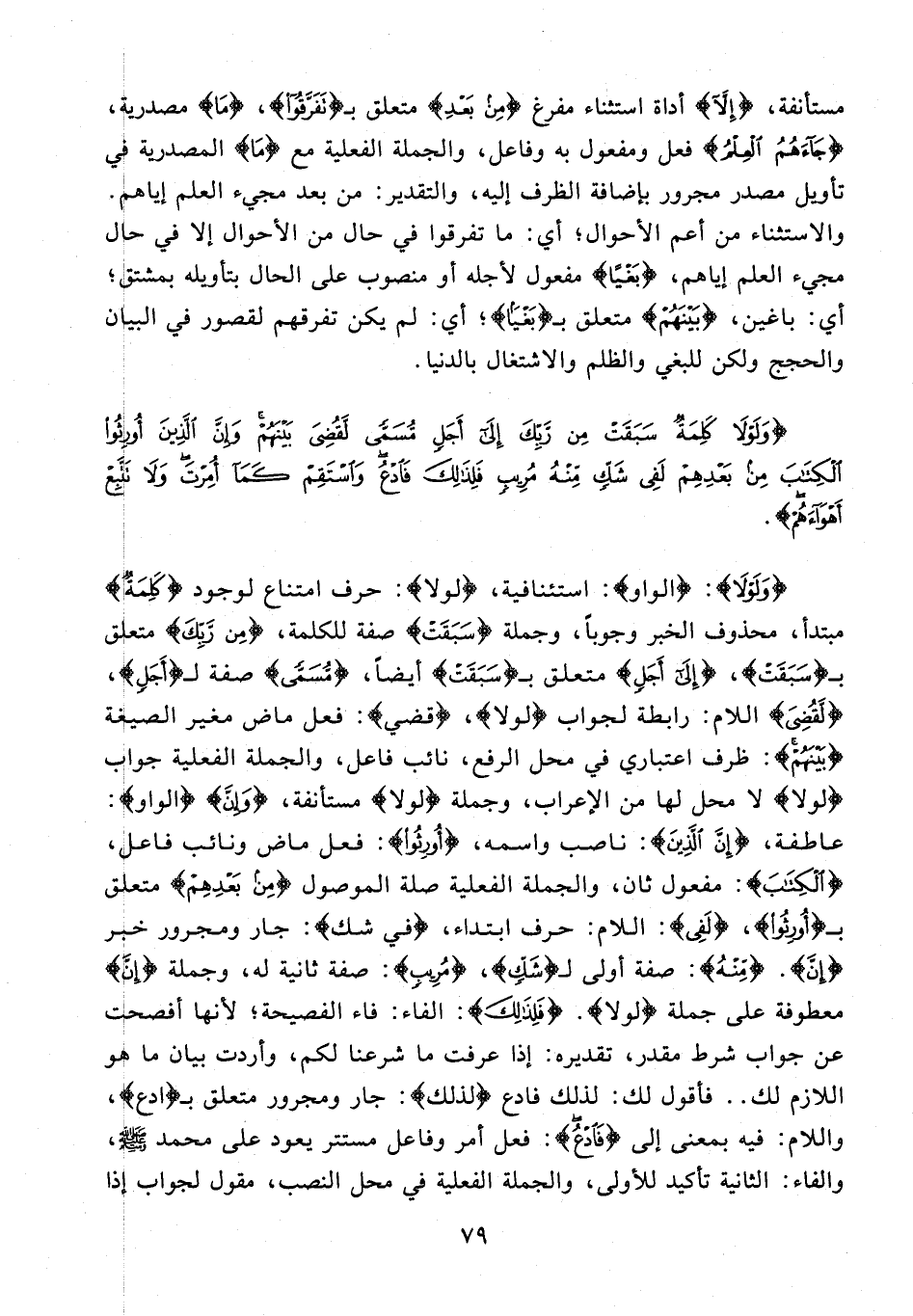 {وَلَوْلَا}: {الواو}: استئنافية، {لولا}: حرف امتناع لوجود {كَلِمَةٌ} مبتدأ، محذوف الخبر وجوبًا، وجملة {سَبَقَتْ} صفة للكلمة، {مِنْ رَبِّكَ} متعلق بـ {سَبَقَتْ}، {إِلَى أَجَلٍ} متعلق بـ {سَبَقَتْ} أيضًا، {مُسَمًّى} صفة لـ {أَجَلٍ}، {لَقُضِيَ} اللام: رابطة لجواب {لولا}، {قضي}: فعل ماض مغير الصيغة {بَيْنَهُمْ}: ظرف اعتباري في محل الرفع، نائب فاعل، والجملة الفعلية جواب {لولا} لا محل لها من الإعراب، وجملة {لولا} مستأنفة، {وَإِنَّ} {الواو}: عاطفة، {إِنَّ الَّذِينَ}: ناصب واسمه، {أُورِثُوا}: فعل ماض ونائب فاعل، {الْكِتَابَ}: مفعول ثان، والجملة الفعلية صلة الموصول {مِنْ بَعْدِهِمْ} متعلق بـ {أُورِثُوا}، {لَفِى}: اللام: حرف ابتداء، {في شك}: جار ومجرور خبر {إنَّ}. {مِنْهُ}: صفة أولى لـ {شَكٍّ}، {مُرِيبٍ}: صفة ثانية له، وجملة {إِنَّ} معطوفة على جملة {لولا}. {فَلِذَلِكَ}: الفاء: فاء الفصيحة؛ لأنها أفصحت عن جواب شرط مقدر، تقديره: إذا عرفت ما شرعنا لكم، وأردت بيان ما هو اللازم لك .. فأقول لك: لذلك فادع {لذلك}: جار ومجرور متعلق بـ {ادع}، واللام: فيه بمعنى إلى {فَادْعُ}: فعل أمر وفاعل مستتر يعود على محمد - صلى الله عليه وسلم -، والفاء: الثانية تأكيد للأولى، والجملة الفعلية في محل النصب، مقول لجواب إذا