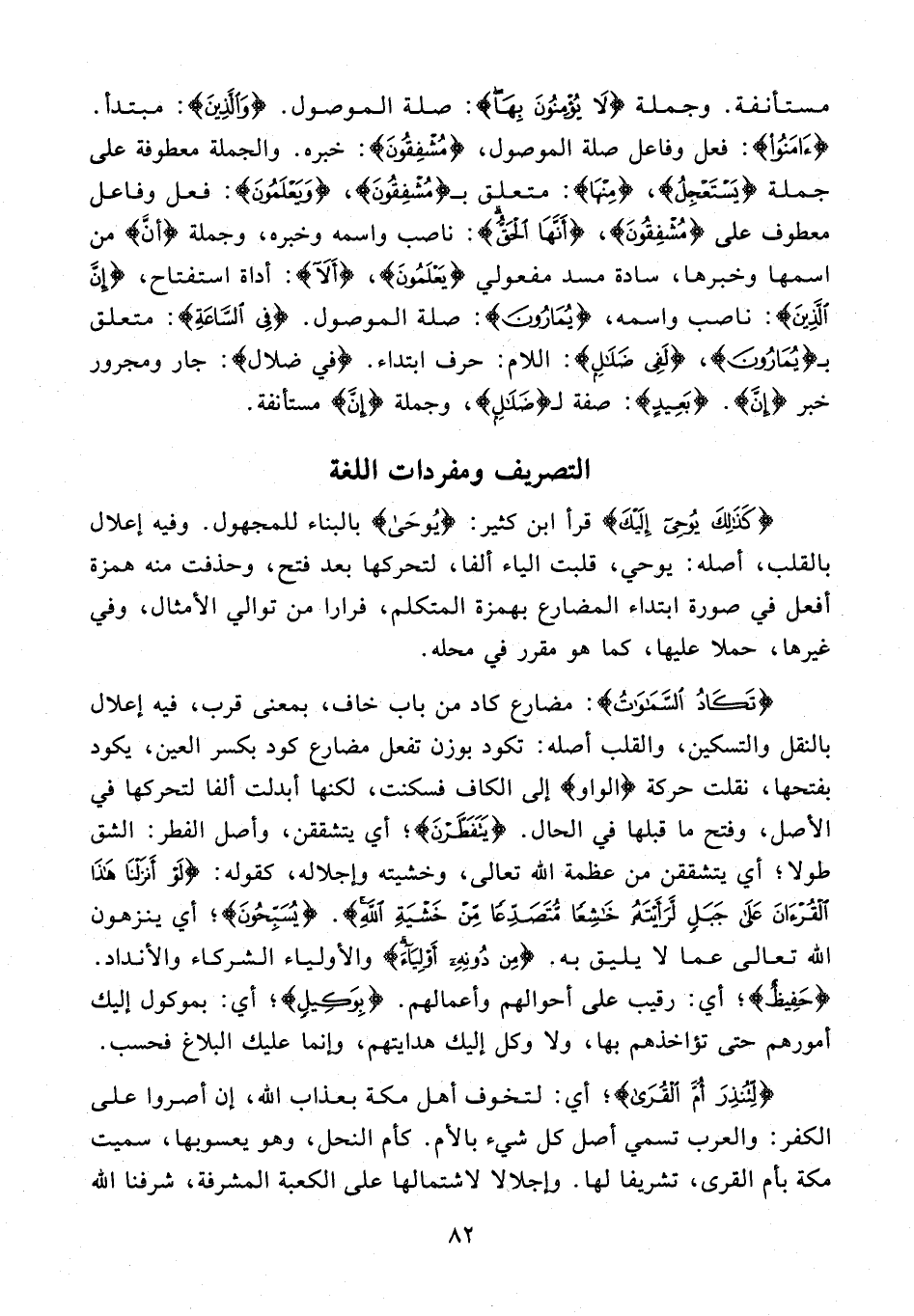 مستأنفة. وجملة {لَا يُؤْمِنُونَ بِهَا}: صلة الموصول. {وَالَّذِينَ}: مبتدأ. {آمَنُوا}: فعل وفاعل صلة الموصول، {مُشْفِقُونَ}: خبره. والجملة معطوفة على جملة {يَسْتَعْجِلُ}، {مِنْهَا}: متعلق بـ {مُشْفِقُونَ}، {وَيَعْلَمُونَ}: فعل وفاعل معطوف على {مُشْفِقُونَ}، {أَنَّهَا الْحَقُّ}: ناصب واسمه وخبره، وجملة {أَنَّ} من اسمها وخبرها، سادة مسد مفعولي {يَعْلَمُونَ}، {أَلَا}: أداة استفتاح، {إِنَّ الَّذِينَ}: ناصب واسمه، {يُمَارُونَ}: صلة الموصول. {فِي السَّاعَةِ}: متعلق بـ {يُمَارُونَ}، {لَفِي ضَلَالٍ}: اللام: حرف ابتداء. {فِي ضَلَالٍ}: جار ومجرور خبر {إِنَّ}. {بَعِيدٍ}: صفة لـ {ضَلَالٍ}، وجملة {إِنَّ} مستأنفة.
