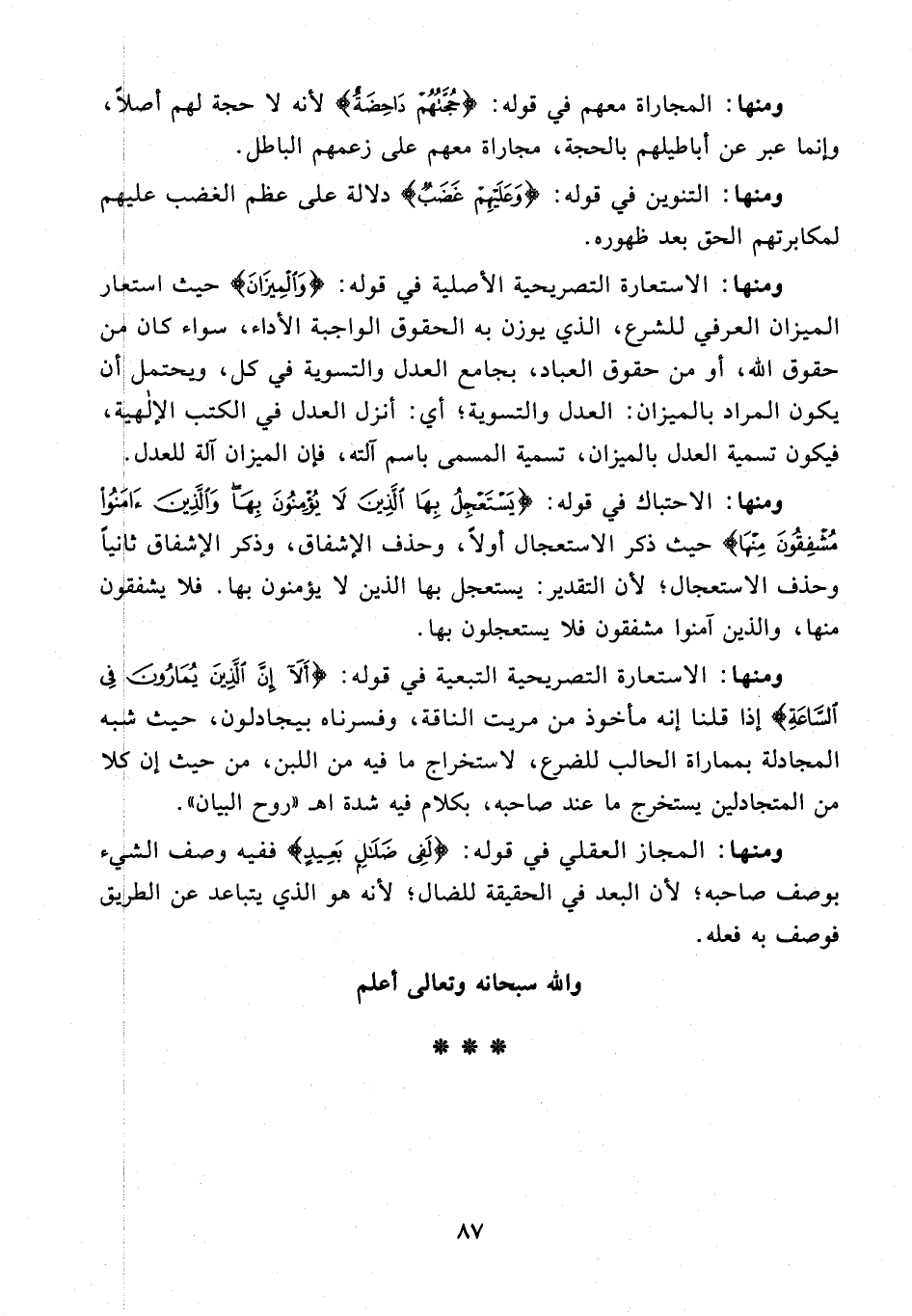 ومنها: الاستعارة التصريحية الأصلية في قوله: {وَالْمِيزَانَ} حيث استعار الميزان العرفي للشرع، الذي يوزن به الحقوق الواجبة الأداء، سواء كان من حقوق الله، أو من حقوق العباد، بجامع العدل والتسوية في كل، ويحتمل أن يكون المراد بالميزان: العدل والتسوية؛ أي: أنزل العدل في الكتب الإلهية، فيكون تسمية العدل بالميزان، تسمية المسمى باسم آلته، فإن الميزان آلة للعدل.