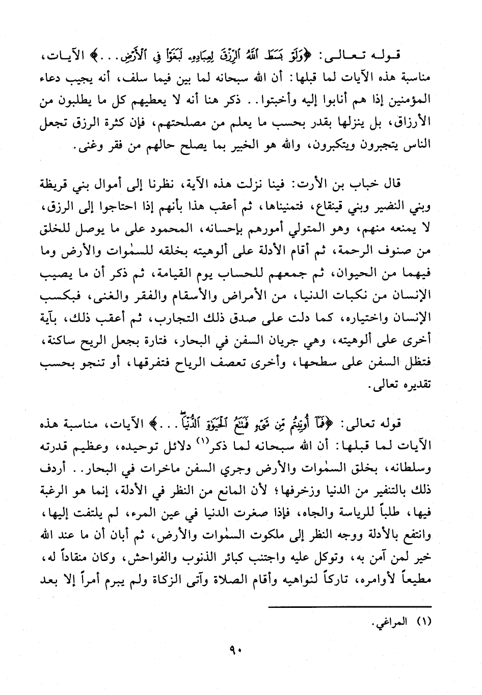 قال خباب بن الأرت: فينا نزلت هذه الآية، نظرنا إلى أموال بني قريظة وبني النضير وبني قينقاع، فتمنيناها، ثم أعقب هذا بأنهم إذا احتاجوا إلى الرزق، لا يمنعه منهم، وهو المتولي أمورهم بإحسانه، المحمود على ما يوصل للخلق من صنوف الرحمة، ثم أقام الأدلة على ألوهيته بخلقه للسموات والأرض وما فيهما من الحيوان، ثم جمعهم للحساب يوم القيامة، ثم ذكر أن ما يصيب الإنسان من نكبات الدنيا، من الأمراض والأسقام والفقر والغنى، فبكسب الإنسان واختياره، كما دلت على صدق ذلك التجارب، ثم أعقب ذلك، بآية أخرى على ألوهيته، وهي جريان السفن في البحار، فتارة بجعل الريح ساكنة، فتظل السفن على سطحها، وأخرى تعصف الرياح فتفرقها، أو تنجو بحسب تقديره تعالى.