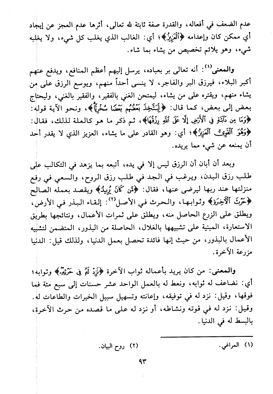 والمعنى: من كان يريد بأعماله ثواب الآخرة {نَزِدْ لَهُ فِي حَرْثِهِ} وثوابه؛ أي: نضاعف له ثوابه، ونعط له بالعمل الواحد عشر حسنات إلى سبع مئة فما فوقها، وقيل: نزد له في توفيقه، وإعانته وتسهيل سبيل الخيرات والطاعات له. وقيل: نزد له في قوته ونشاطه، أو نزد له على ما قصده من حرث الآخرة، بالبسط له في الدنيا.