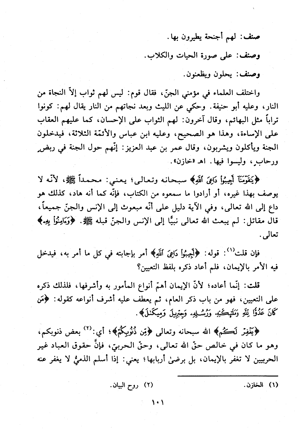 31 - {يَا قَوْمَنَا أَجِيبُوا دَاعِيَ اللهِ} سبحانه وتعالى؛ يعني: محمدًا - صلى الله عليه وسلم - , لأنّه لا يوصف بهذا غيره، أو أرادوا ما سمعوه من الكتاب، فإنّه كما أنه هاد، كذلك هو داع إلى الله تعالى، وفي الآية دليل على أنّه مبعوث إلى الإنس والجنّ جميعًا، قال مقاتل: لم يبعث الله تعالى نبيًّا إلى الإنس والجنّ قبله - صلى الله عليه وسلم -. {وَآمِنُوا بِهِ} تعالى.