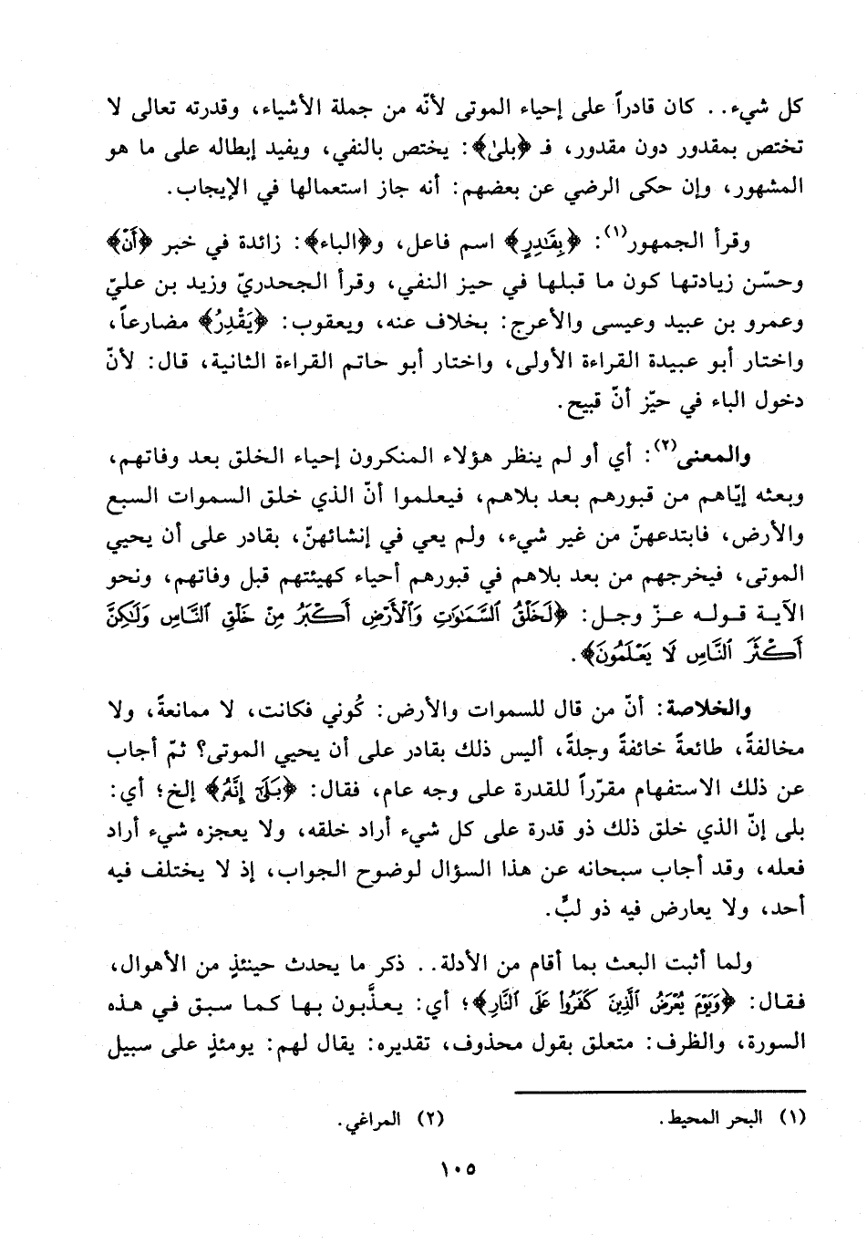 وقرأ الجمهور (¬1): {بِقَادِرٍ} اسم فاعل، و {الباء}: زائدة في خبر {أنْ} وحسّن زيادتها كون ما قبلها في حيز النفي، وقرأ الجحدريّ وزيد بن عليّ وعمرو بن عبيد وعيسى والأعرج: بخلاف عنه، ويعقوب: {يَقْدِرُ} مضارعًا، واختار أبو عبيدة القراءة الأولى، واختار أبو حاتم القراءة الثانية، قال: لأنّ دخول الباء في حيّز أنّ قبيح.