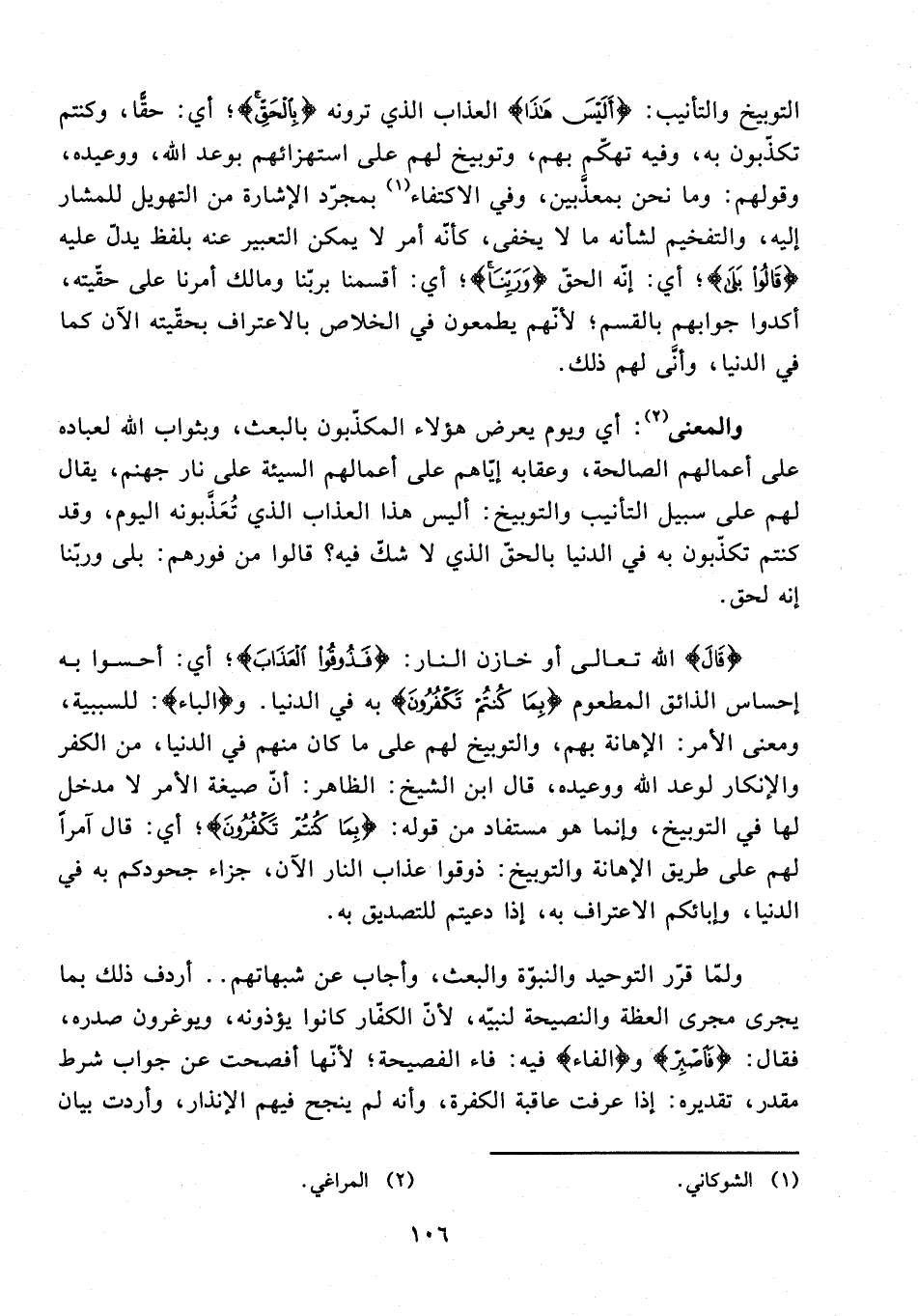 التوبيخ والتأنيب: {أَلَيْسَ هَذَا} العذاب الذي ترونه {بِالْحَقِّ}؛ أي: حقًّا، وكنتم تكذّبون به، وفيه تهكّم بهم، وتوبيخ لهم على استهزائهم بوعد الله، ووعيده، وقولهم: وما نحن بمعذَّبين، وفي الاكتفاء (¬1) بمجرّد الإشارة من التهويل للمشار إليه، والتفخيم لشأنه ما لا يخفى، كأنّه أمر لا يمكن التعبير عنه بلفظ يدلّ عليه {قَالُوا بَلَى}؛ أي: إنه الحقّ {وَرَبِّنَا}؛ أي: أقسمنا بربّنا ومالك أمرنا على حقّيته، أكدوا جوابهم بالقسم؛ لأنّهم يطمعون في الخلاص بالاعتراف بحقّيته الآن كما في الدنيا، وأنَّى لهم ذلك.