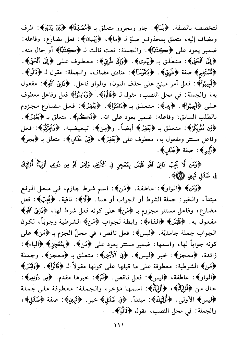 لتخصصه بالصفة. {لِمَا}: جار ومجرور متعلق بـ {مُصَدِّقًا} {بَيْنَ يَدَيْهِ}: ظرف ومضاف إليه، متعلق بمحذوفٍ صلةٍ لـ {ما}، {يَهْدِي}: فعل مضارع، وفاعله: ضمير يعود على {كِتَابًا}. والجملة: نعت ثالث لـ {كِتَابًا} أو حال منه. {إِلَى الْحَقِّ}: متعلق بـ {يَهْدِي}. {وَإِلَى طَرِيقٍ}: معطوف على {إِلَى الْحَقِّ}. {مُسْتَقِيمٍ} صفة {طَرِيقٍ}. {يَا قَوْمَنَا}: منادى مضاف، والجملة: مقول لـ {قَالُوا} {أَجِيبُوا}: فعل أمر مبنيّ على حذف النون، والواو فاعل. {دَاعِيَ اللهِ}: مفعول به، والجملة: في محل النصب، مقول لـ {قَالُوا}. {وَآمِنُوا} فعل وفاعل معطوف على {أَجِيبُوا}. {بِهِ}: متعلق بـ {آمِنُوا}. {يَغْفِرْ}: فعل مضارع مجزوم بالطلب السابق، وفاعله: ضمير يعود على الله. {لَكُمْ}. متعلق بـ {يَغْفِرْ}. {مِنْ ذُنُوبِكُمْ}: متعلق بـ {يَغْفِرْ} أيضًا. و {مِن}: تبعيضية. {وَيُجِرْكُمْ}: فعل وفاعل مستتر ومفعول به، معطوف على {يَغْفِر}، {مِنْ عَذَابٍ}: متعلق بـ {يُجِر} {أَلِيمٍ}: صفة {عَذَابٍ}.