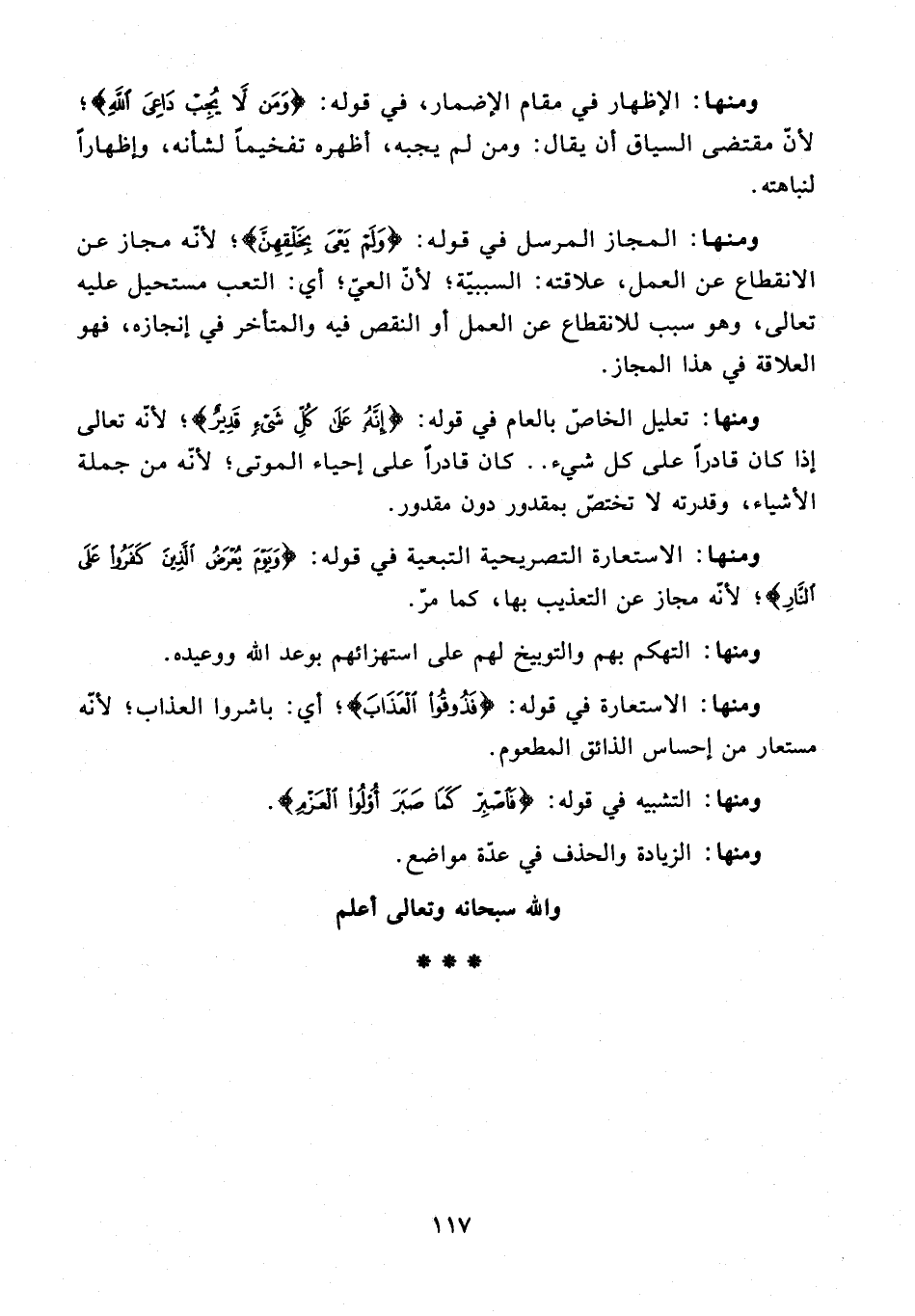ومنها: المجاز المرسل في قوله: {وَلَمْ يَعْيَ بِخَلْقِهِنَّ}؛ لأنّه مجاز عن الانقطاع عن العمل، علاقته: السببيّة؛ لأنّ العيّ؛ أي: التعب مستحيل عليه تعالى، وهو سبب للانقطاع عن العمل أو النقص فيه والمتأخر في إنجازه، فهو العلاقة في هذا المجاز.
