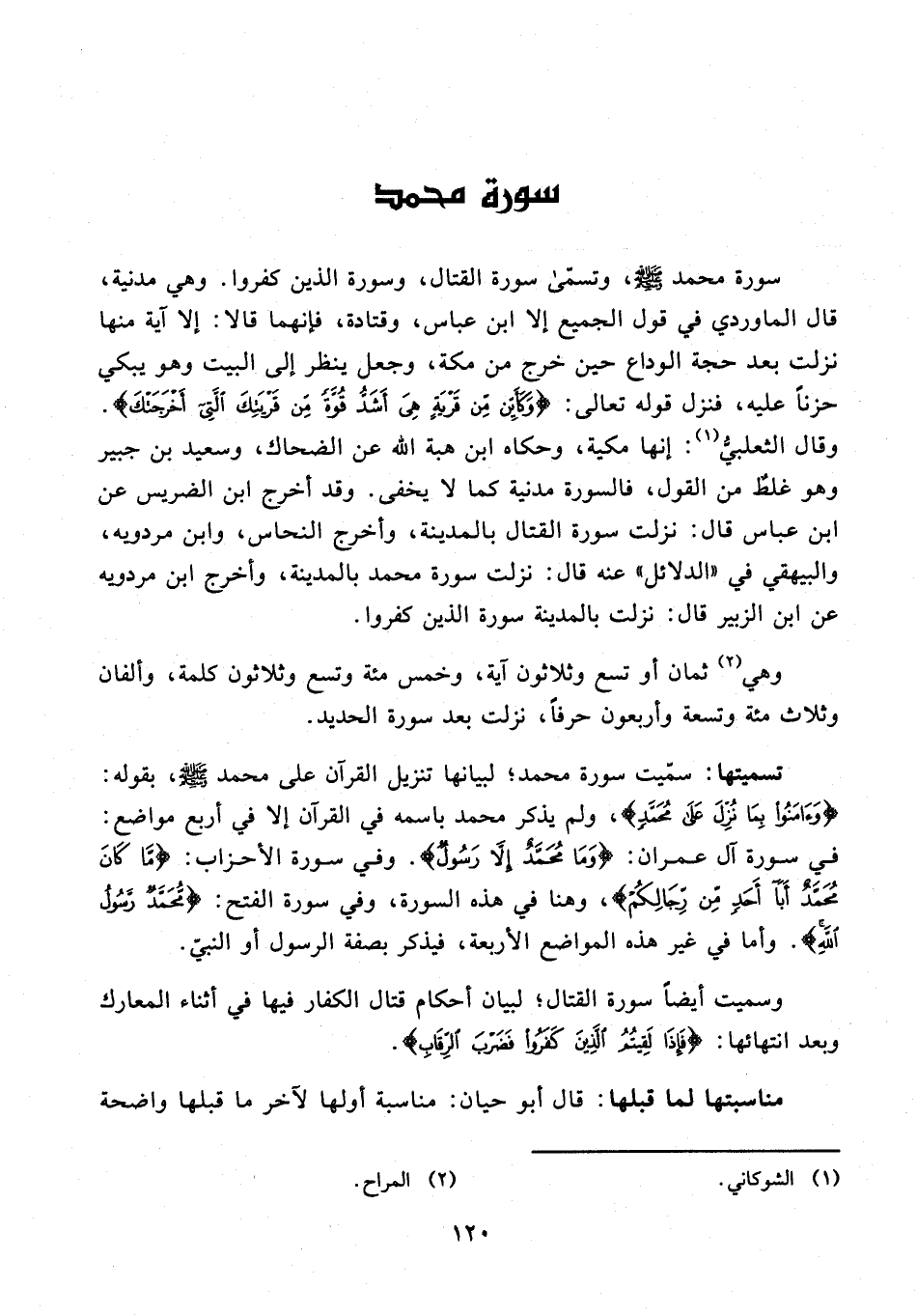 سورة محمد - صلى الله عليه وسلم -، وتسمّى سورة القتال، وسورة الذين كفروا. وهي مدنية، قال الماوردي في قول الجميع إلا ابن عباس، وقتادة، فإنهما قالا: إلا آية منها نزلت بعد حجة الوداع حين خرج من مكة، وجعل ينظر إلى البيت وهو يبكي حزنًا عليه، فنزل قوله تعالى: {وَكَأَيِّنْ مِنْ قَرْيَةٍ هِيَ أَشَدُّ قُوَّةً مِنْ قَرْيَتِكَ الَّتِي أَخْرَجَتْكَ}. وقال الثعلبيُّ (¬1): إنها مكية، وحكاه ابن هبة الله عن الضحاك، وسعيد بن جبير وهو غلطٌ من القول، فالسورة مدنية كما لا يخفى. وقد أخرج ابن الضريس عن ابن عباس قال: نزلت سورة القتال بالمدينة، وأخرج النحاس، وابن مردويه، والبيهقي في "الدلائل" عنه قال: نزلت سورة محمد بالمدينة، وأخرج ابن مردويه عن ابن الزبير قال: نزلت بالمدينة سورة الذين كفروا.
