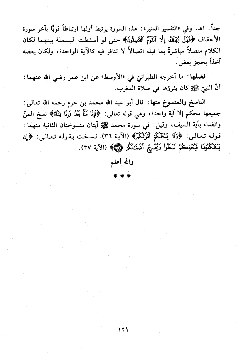 الناسخ والمنسوخ منها: قال أبو عبد الله محمد بن حزم رحمه الله تعالى: جميعها محكم إلا آية واحدة، وهي قوله تعالى. {فَإِمَّا مَنًّا بَعْدُ وَإِمَّا فِدَاءً} نسخ المنّ والفداء بآية السيف، وقيل: في سورة محمد - صلى الله عليه وسلم - آيتان منسوختان الثانية منهما: قوله تعالى: {وَلَا يَسْأَلْكُمْ أَمْوَالَكُمْ} (الآية 36). نسخت بقوله تعالى: {إِنْ يَسْأَلْكُمُوهَا فَيُحْفِكُمْ تَبْخَلُوا وَيُخْرِجْ أَضْغَانَكُمْ (37)} (الآية 37).
