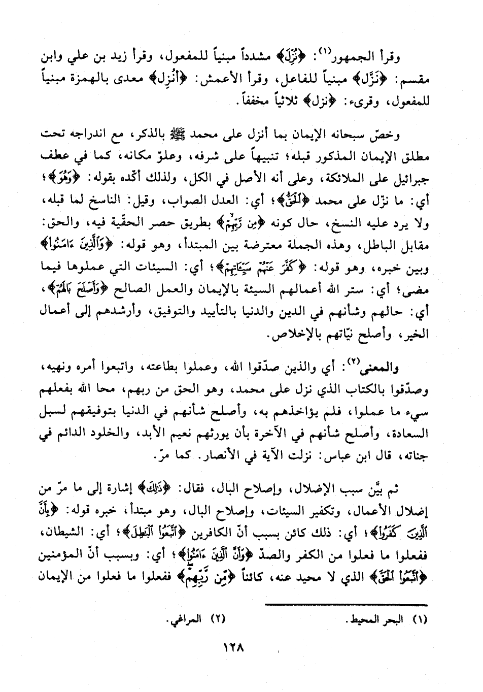 وخصّ سبحانه الإيمان بما أنزل على محمد - صلى الله عليه وسلم - بالذكر، مع اندراجه تحت مطلق الإيمان المذكور قبله؛ تنبيهًا على شرفه، وعلوّ مكانه، كما في عطف جبرائيل على الملائكة، وعلى أنه الأصل في الكل، ولذلك أكّده بقوله: {وَهُوَ}؛ أي: ما نزّل على محمد {الْحَقُّ}؛ أي: العدل الصواب، وقيل: الناسخ لما قبله، ولا يرد عليه النسخ، حال كونه {مِنْ رَبِّهِمْ} بطريق حصر الحقّية فيه، والحق: مقابل الباطل، وهذه الجملة معترضة بين المبتدأ، وهو قوله: {الَّذِينَ آمَنُوا} وبين خبره، وهو قوله: {كَفَّرَ عَنْهُمْ سَيِّئَاتِهِمْ}؛ أي: السيئات التي عملوها فيما مضى؛ أي: ستر الله أعمالهم السيئة بالإيمان والعمل الصالح {وَأَصْلَحَ بَالَهُمْ}، أي: حالهم وشأنهم في الدين والدنيا بالتأييد والتوفيق، وأرشدهم إلى أعمال الخير، وأصلح نيّاتهم بالإخلاص.